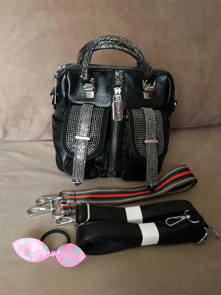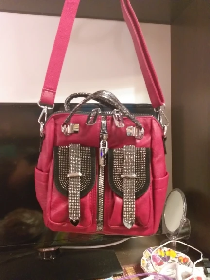 Небольшой рюкзачок, но вместительный. Пошит аккуратно, кожзам мягкий, цвет вишнёвый очень красивый. Внутри одно отделение и два маленьких кармашка, один застегивается на замочек. Спереди накладные кармашки застегиваются на магниты. Имеются ещё две длинные ручки, одна пристегивается по бокам, чтобы носить через плечо, а другая сзади, чтобы носить как рюкзачок, это кому как больше нравится! Продавец положил ещё в подарок резиночку. Мелочь, а приятно!