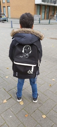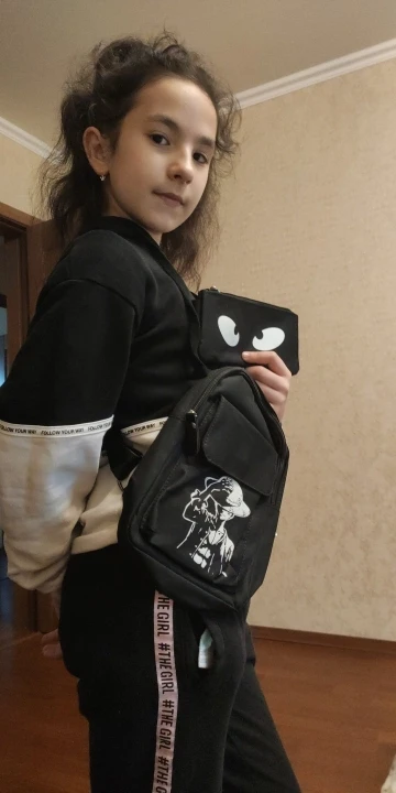 ребенок счастлив! богатая комплектация, есть кошелек, наушники, пенал, замочек! куча всяких проводочков, прикольно! для 3 классника (9 лет) размер S в самый раз, вместительный, даже на вырост пойдет