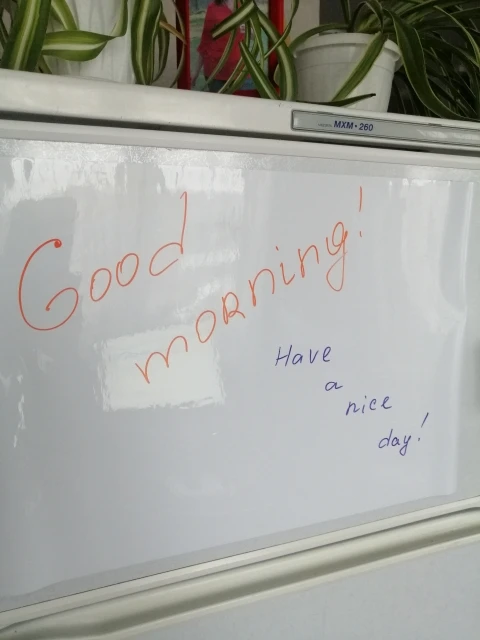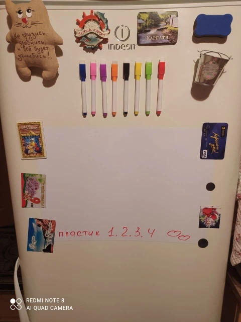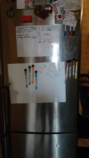 в комплекте только один черный маркер, а на рисунке есть ещё и красный. Слабоват магнит самой доски. Пришлось разглаживать чтоб крепко держалась на холодильнике. (может из за не идеально гладкой поверхности холодильника) а так всё отлично!