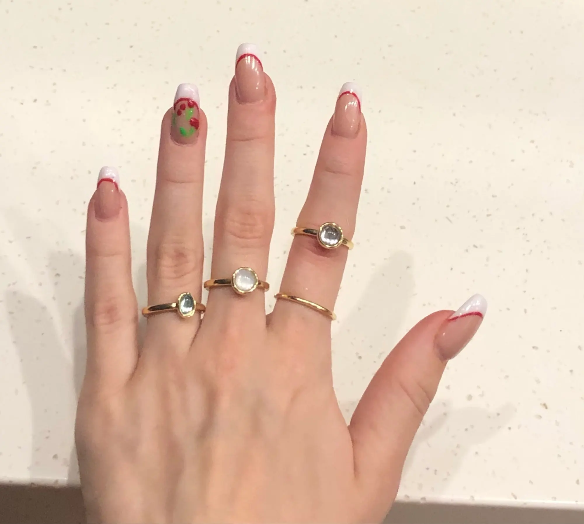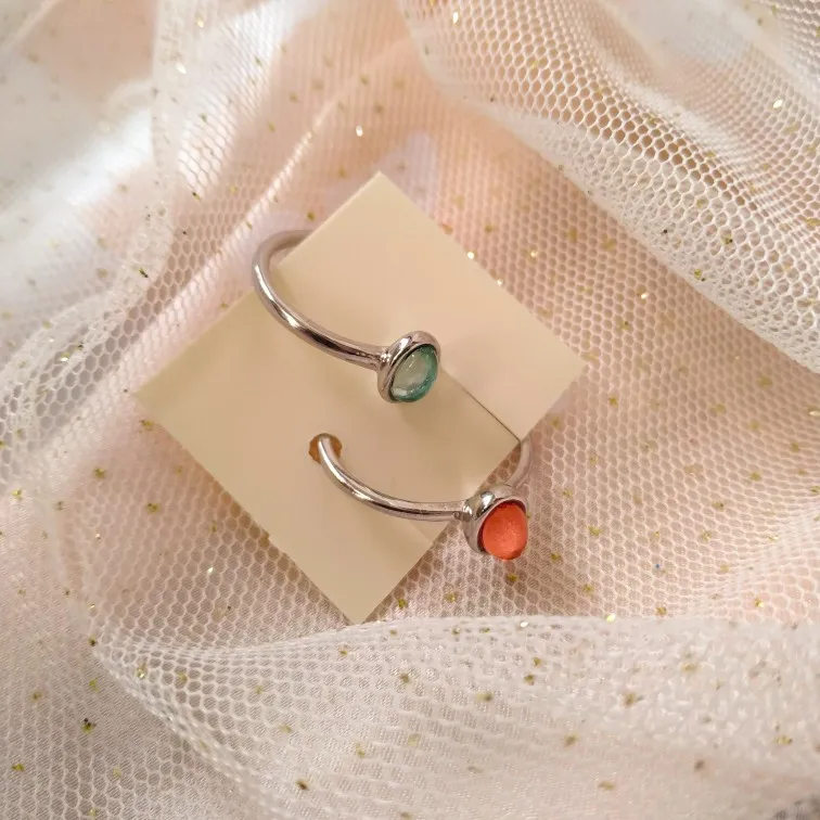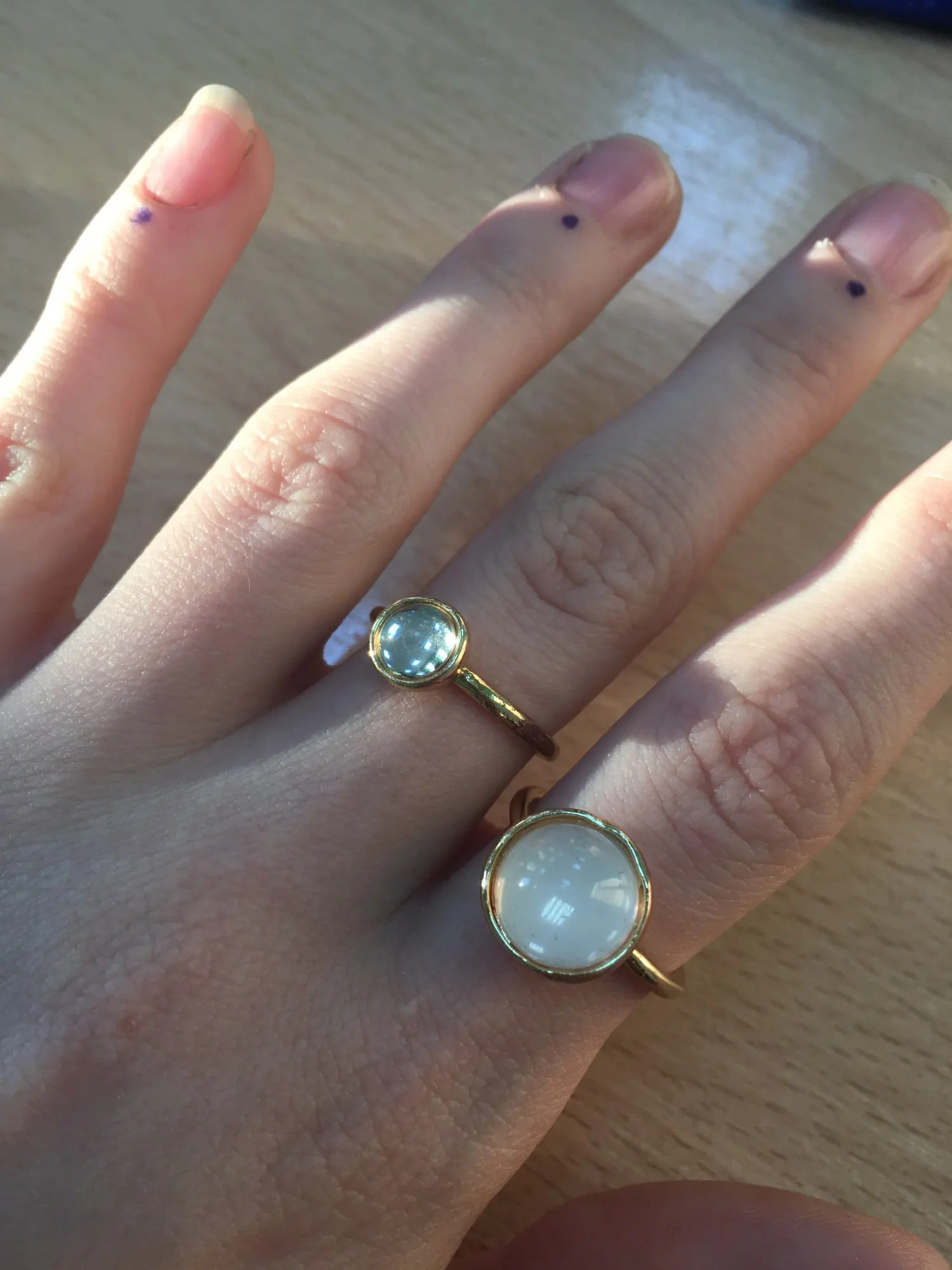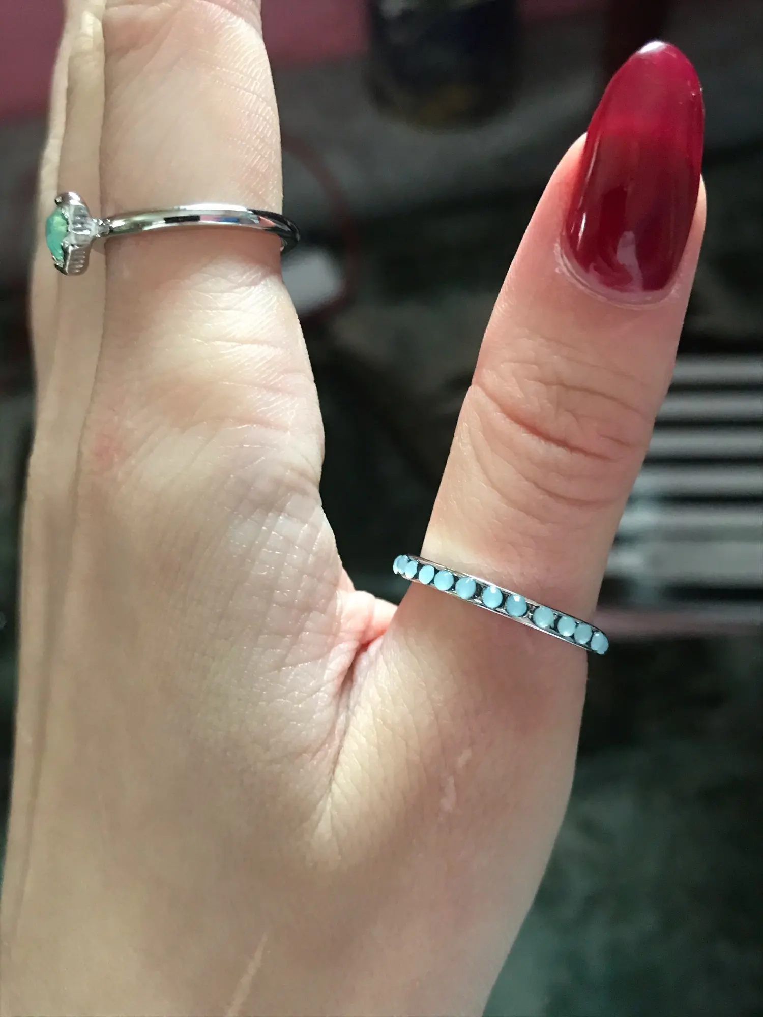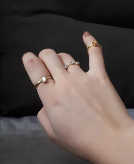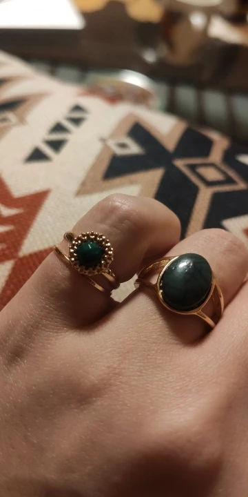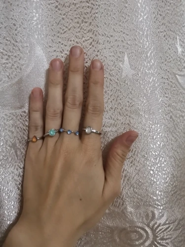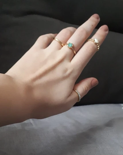 колечки очень хорошие, качественные.мыла с ними посуду, не потускнело, не поржавело.смотрятся аккуратно, нежно.обязательно закажу ещё одни позже!процветания продавцу этого потрясающего магазина. третье колечко уже потеряла, но камушек был приклеен хорошо и ровно, если найду, то обязательно добавлю фотографию