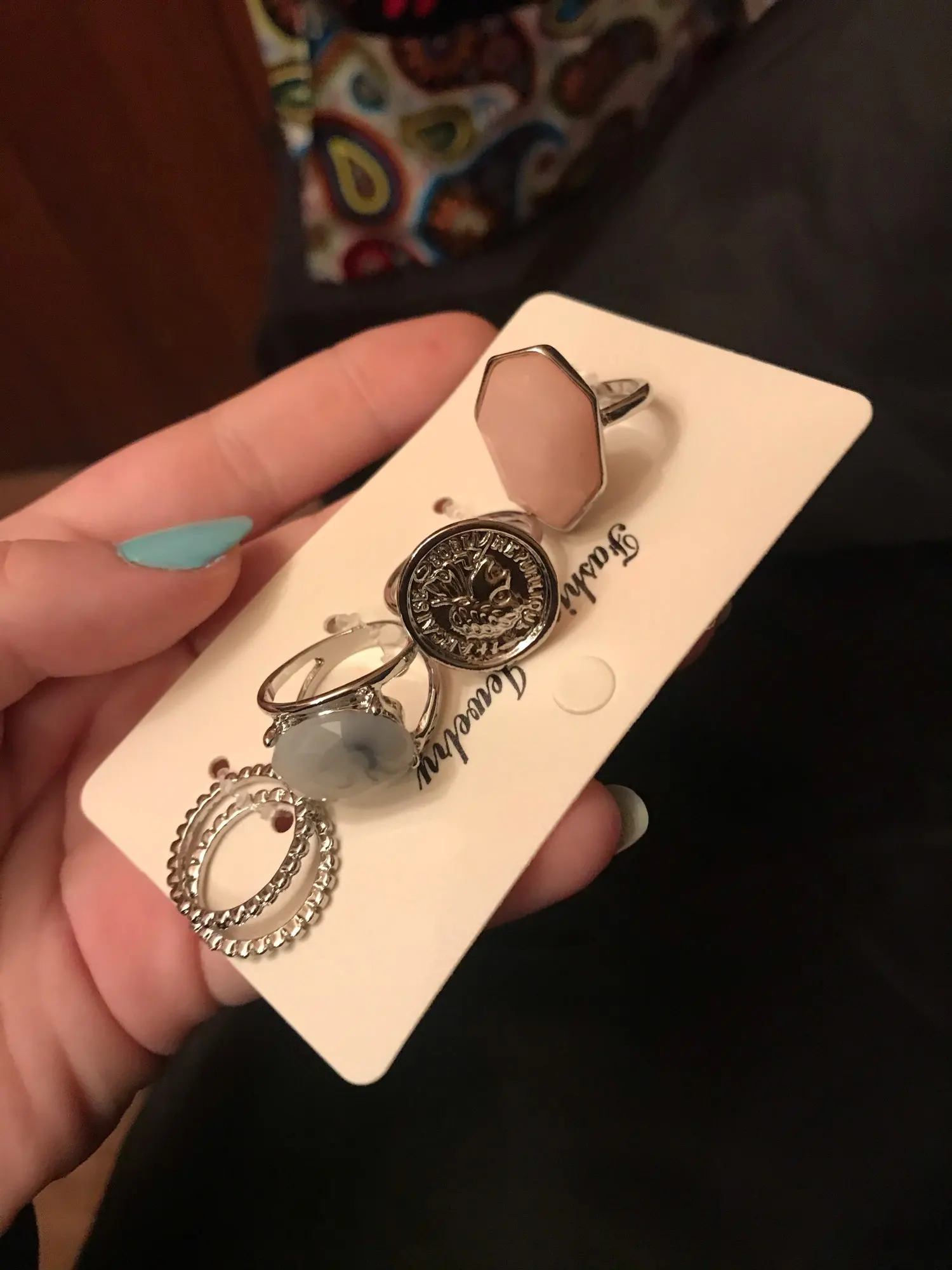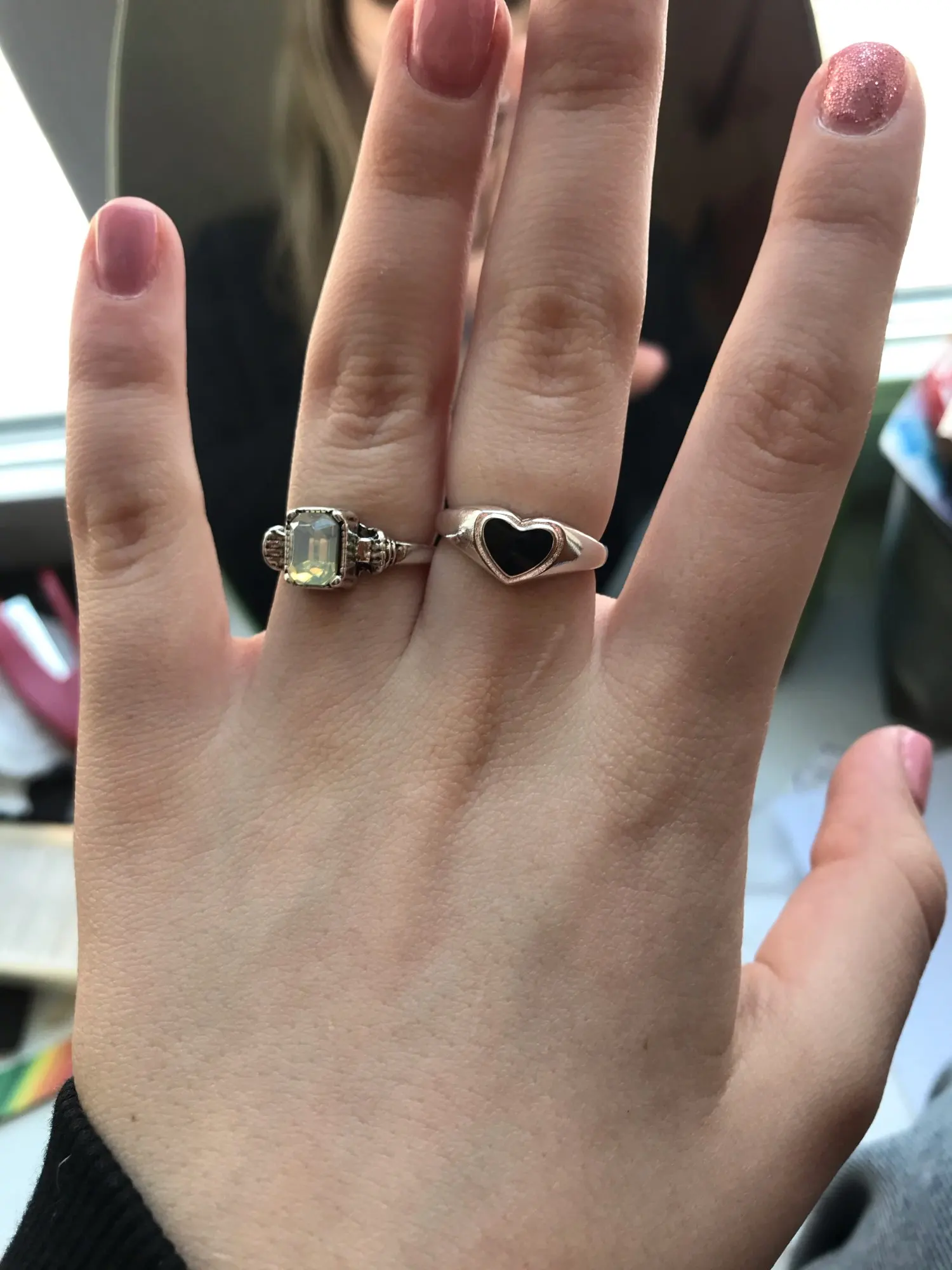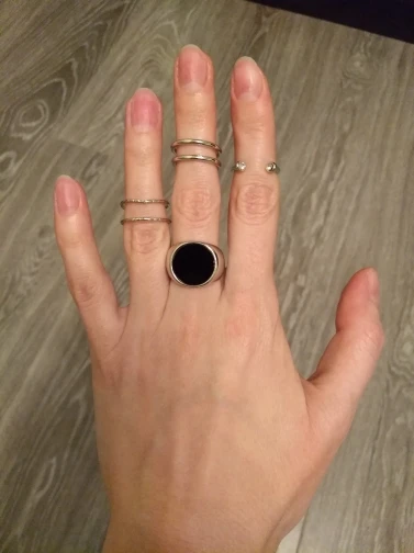Заказ пришёл с другими заказами в одной посылке. Колечки на тонкие пальчики. Кольцо с чёрной вставкой из типа стекла( не могу точно сказать что это такое) мутное и в царапинах. Не такое чёрное как на картинке. Но так как я заказывала дочери и ей понравились вроде. Поэтому 5 звёзд.