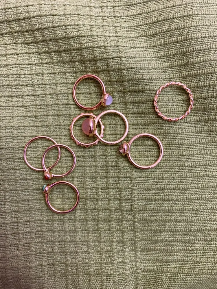 Кольца очень хорошие. Ободки аккуратные, камушки приклеены ровно без торчащего клея. Размеры колец разные, примерно от 16-17. в основном на 16,5. Каждое колечко нашло свой палец хах