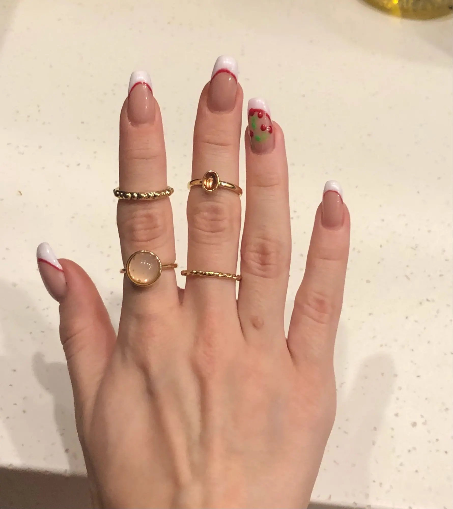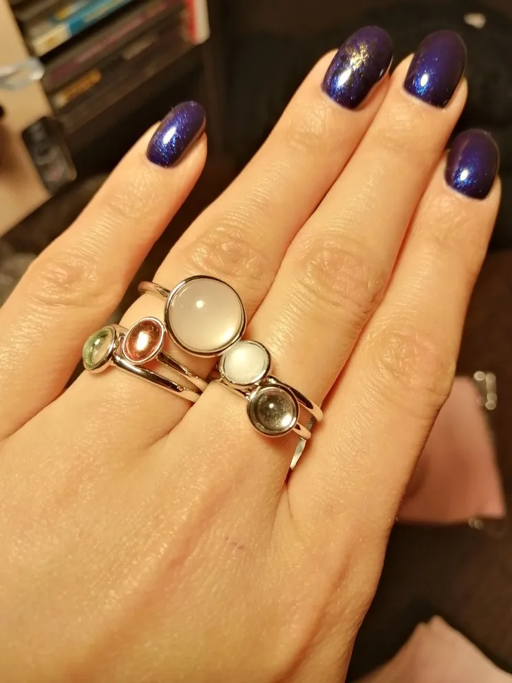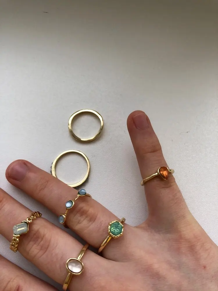 Милые колечки. На мой 15-15,5 я могу надеть некоторые, но больше половины размером на 16-17, мне кажется. Только у трех не очень ровно приклеены «камни» остальные выглядят прилично