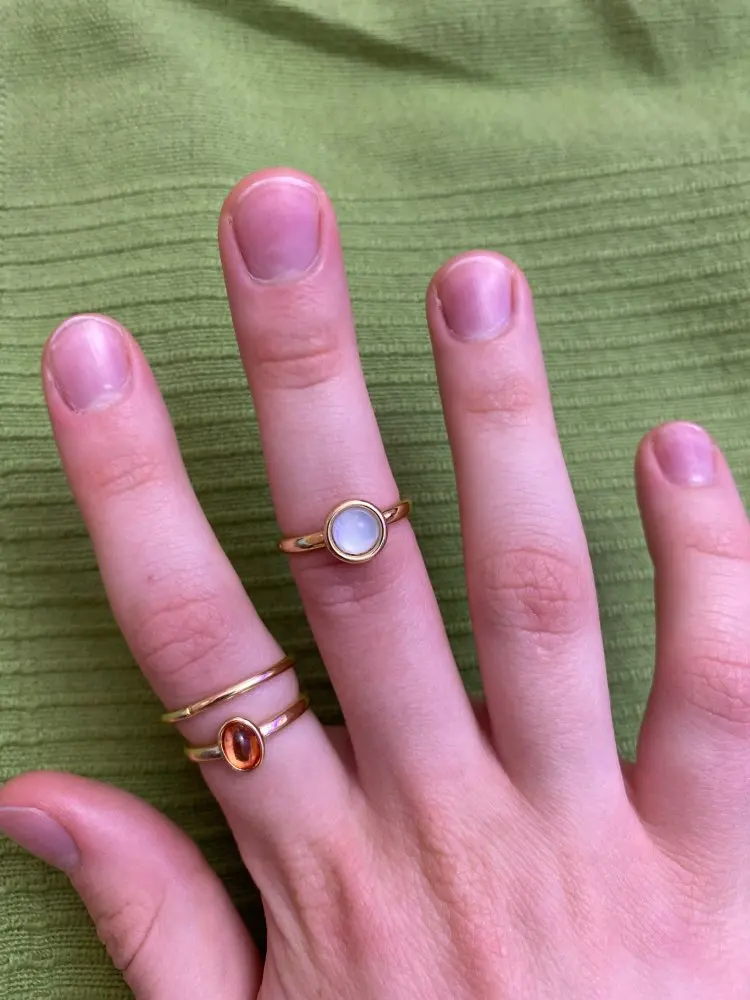 Мне всё понравилось, но кольцо с оранжевым камнем налезает только на большой палец, а с тёмным камнем вообще ни на какой, слишком большое. Кольца как на фото