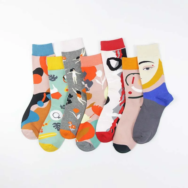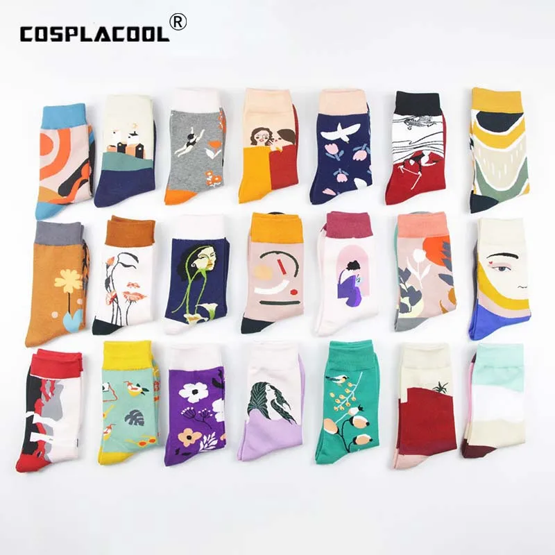 Японские забавные носки в стиле Харадзюку, милые художественные носки с абстрактными цветами, узором птиц, женские Веселые творческие веселые носки, короткие носки