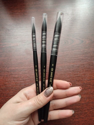 Купила из этого набора тонкие кисти №1 и №3, думаю, этого более чем достаточно, хотя со временем, возможно, закажу и самую большую. У кисточек черная матовая ручка, удобно держать даже толстушку тройку. Кончик тоненький, волоски достаточно упругие, за счёт этого (и благодаря форме) можно рисовать и тонкие, и толстые линии; а вот закрашивать фигуры единичкой не очень, в этот плане тройка удобнее. Из-за того, что у кисти длинный волос, нужно больше воды, чтобы кисть напиталась — для кого-то это минус, но для кого-то огромный плюс. Буду пользоваться, посмотрим, что покажет время.