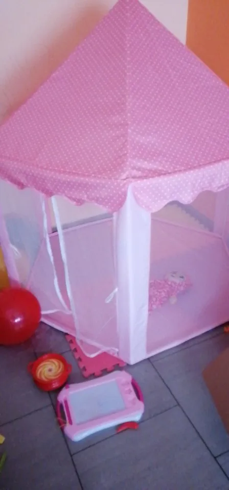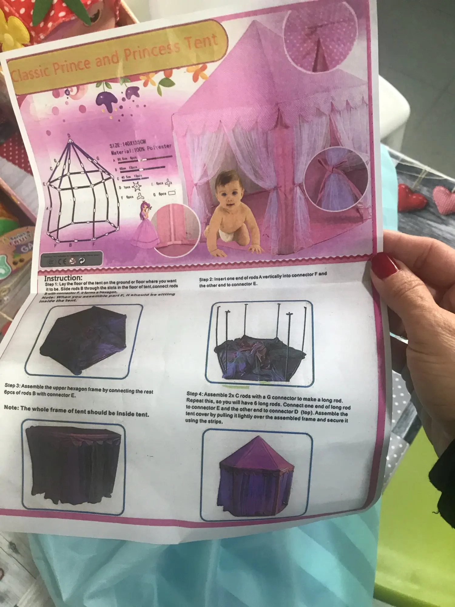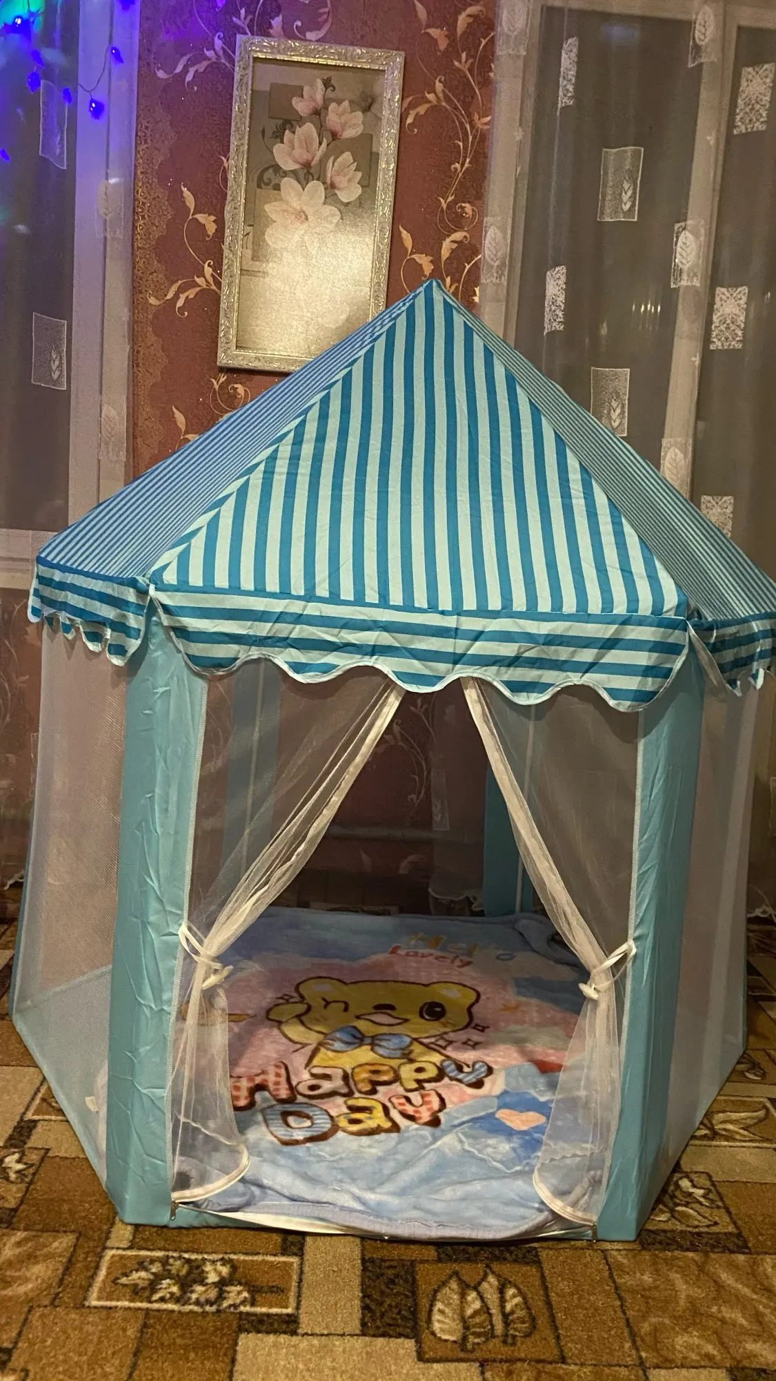Заказ сделал 05.01.2021, пришла 18.01.2021г. (Ставропольский край). Продавец оперативно обработал заказ в праздничные дни и заказ прибыл в течении 13 дней - это отлично. Дочке детская палатка очень понравилась, она довольная. Каркас детской палатки состоит из полихлорвиниловых белых полых трубок, соединяющие между собой с помощью плассмасовых деталей и чехла в моём случае голубого цвета. Полик для палатки не заказывал. Трубки имеют не сильный химический запах. Проблемы возникли при сборке детской палатки. Сначала я собрал каркас, потом попытался чехол натянуть на собранный каркас детской палатки. Мучился долго и ничего не получилось. Пришлось собирать каркас внутри чехла детской палатки, было не удобно, собирали вдвоём. Один держит за макушку крыши чехла палатки, другой мастерит каркас внутри чехла детской палатки. Пришлось попотеть, думаю в следующий раз будет уже побыстрей. Прилагаемая инструкция по сборке детской палатки была на англизком языке и мне мягко говоря не помогла.