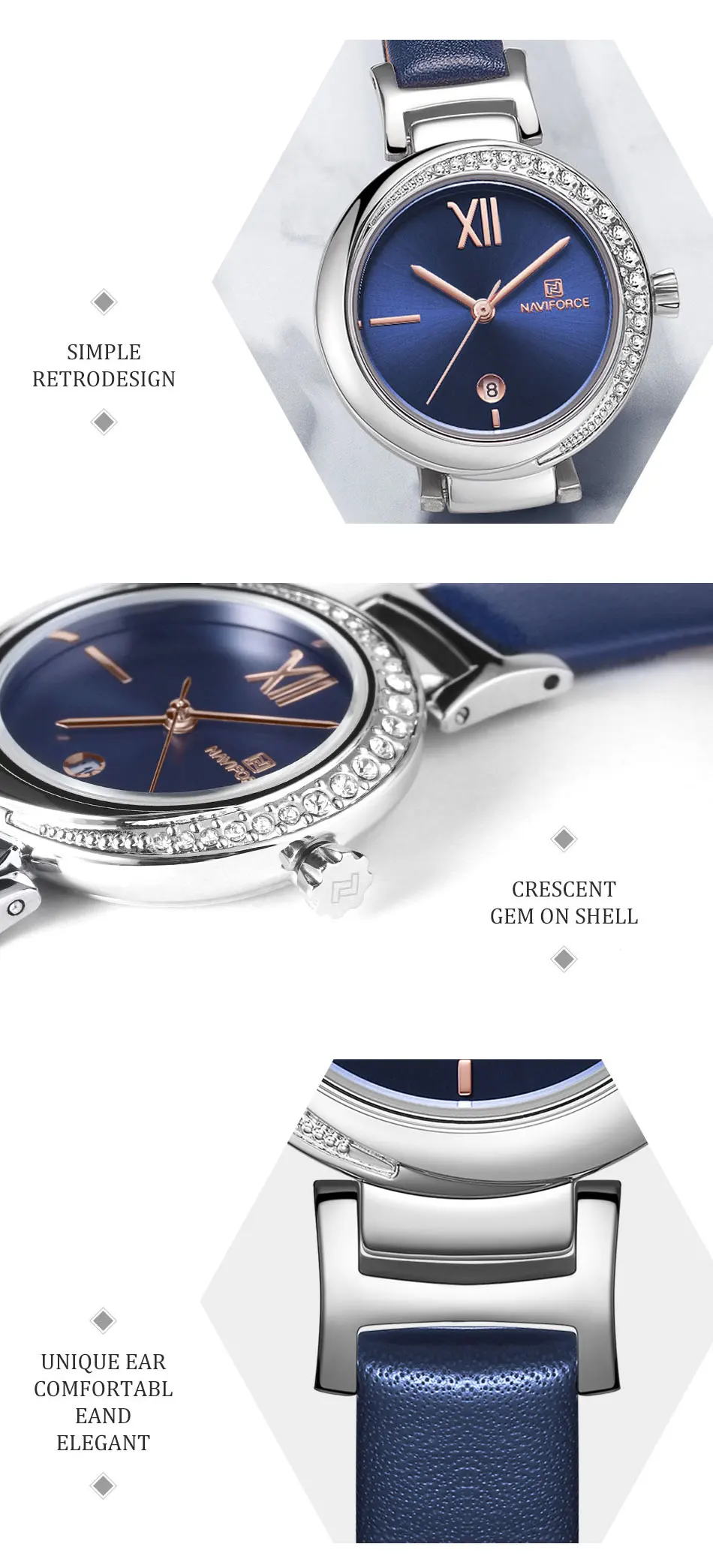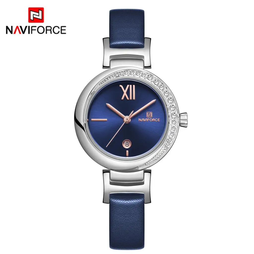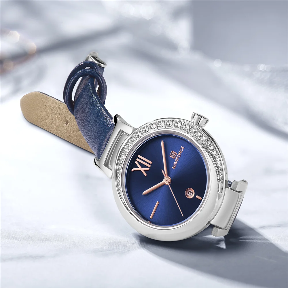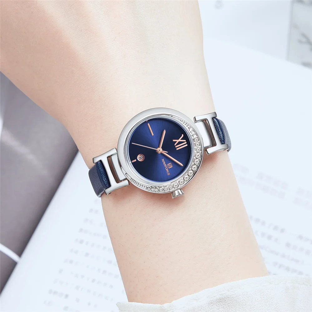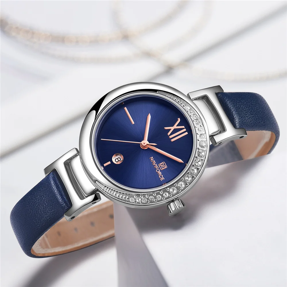 NAVIFORCE Women Watch Fashion Casual Quartz Lady Blue PU Leather Date 3ATM Waterproof Wristwatch Gift for Girl Wife Woman 2019