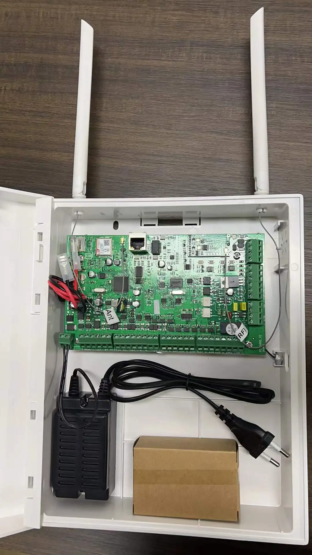 1. Основная панель управления с корпусом X 12. Проводная сенсорная ЖК-клавиатура X 13.AC/AC Трансформатор X 14. Аксессуары: антенна 1 шт., резисторы EOL 1 сумка.(Обратите внимание, что запасная Батарея не входит в комплект)