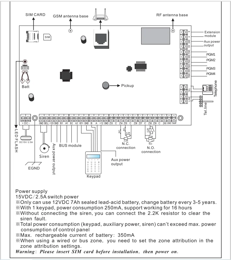 1. Можно разделить на 4 независимых зоны, с 32 беспроводными зонами, 8 проводными зонами, 56 Расширительных зон можно расширить автобусным портом (включая 24 зоны расширения клавиатуры и 32 автобусных зоны), 32 одноавтобусных зоны, общая поддержка 128 зон.