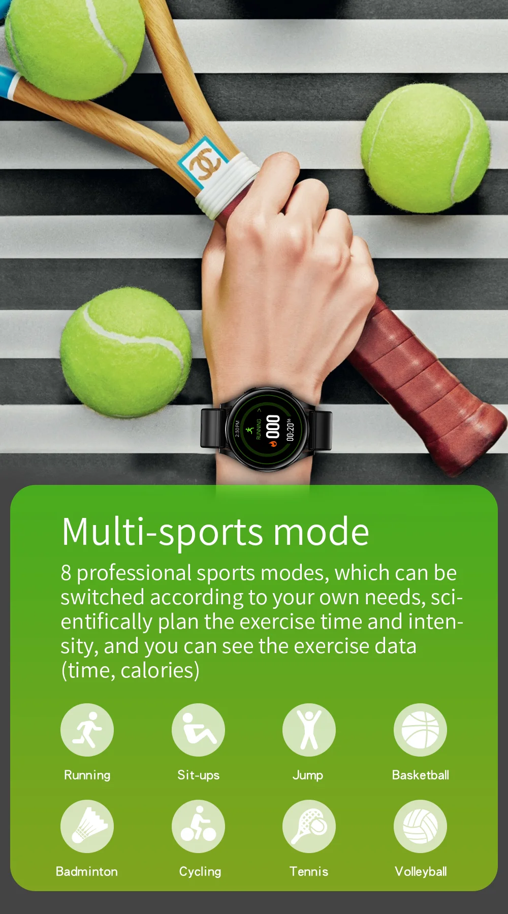 8 спортивных режимов, которые можно переключать в соответствии с вашими потребностями, научно планируйте время и интенсивность упражнений, и вы можете увидеть данные упражнений (время, калории)