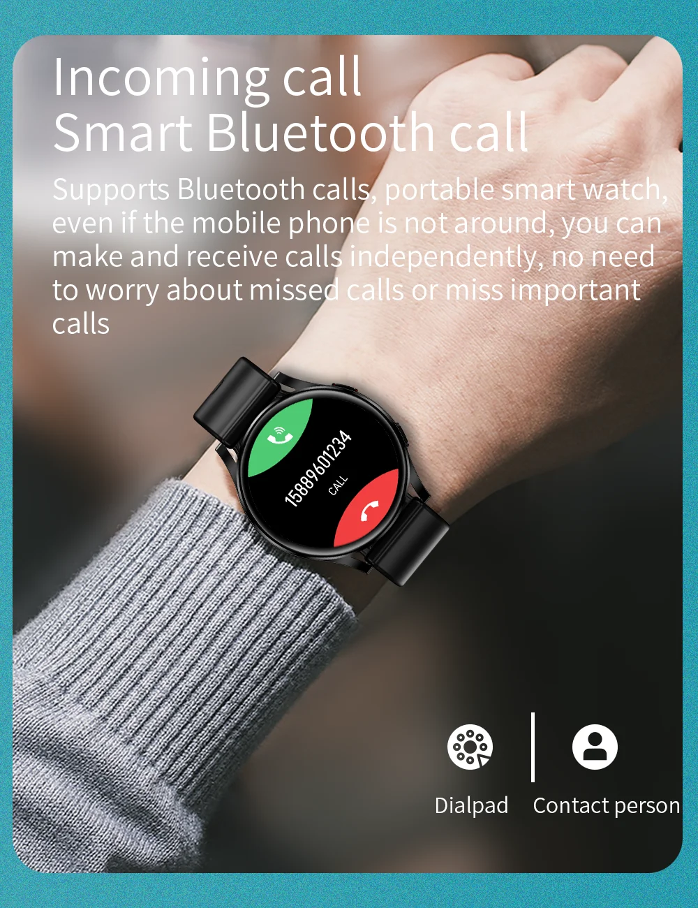 Поддерживает BT звонки, портативные смарт-часы, даже если мобильный телефон не вокруг, вы можете совершать и принимать звонки самостоятельно, не нужно беспокоиться о пропущенных звонках или пропускать важные звонки