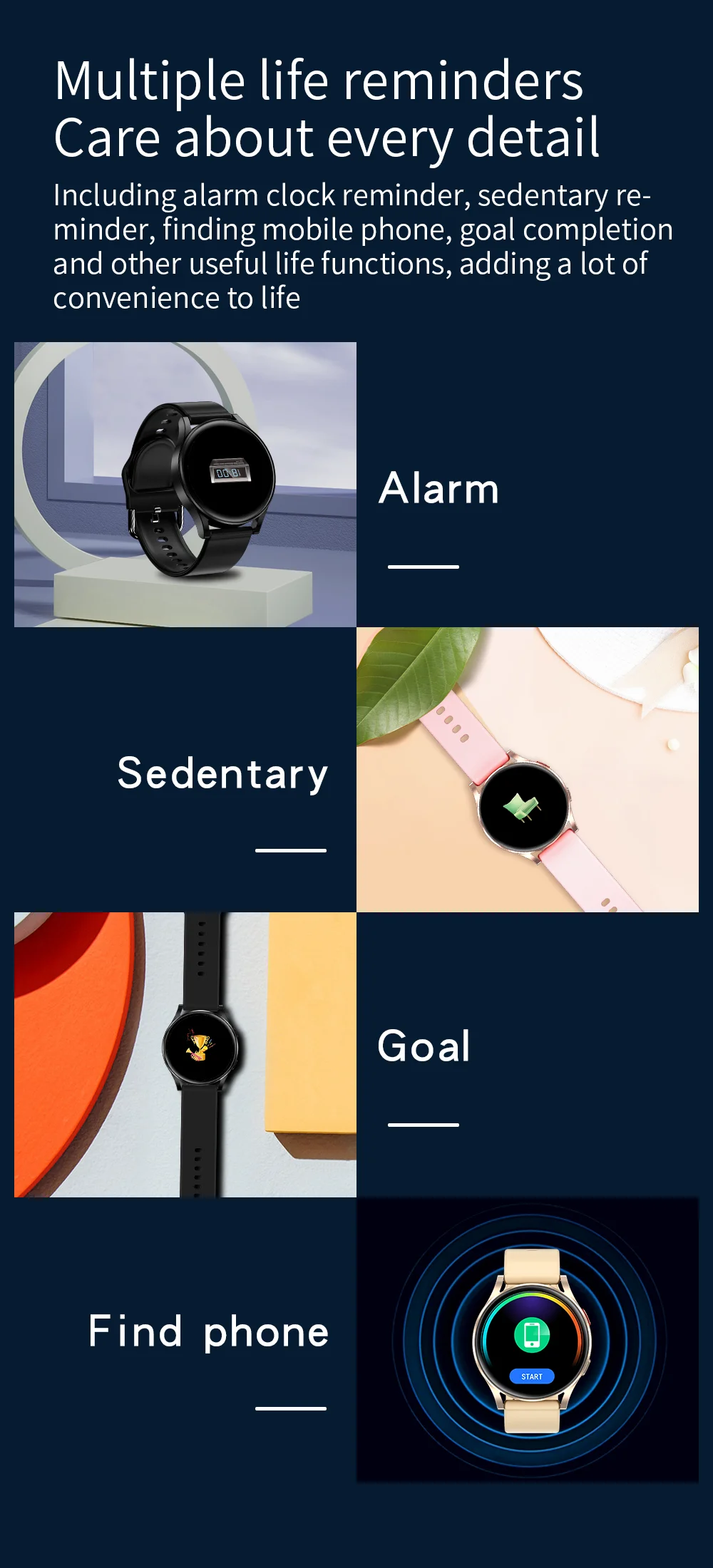 Включая напоминание о будильнике, напоминание о сидячем положении, поиск мобильный телефон, завершение цели и другие полезные функции жизни, добавляя много удобства для жизни