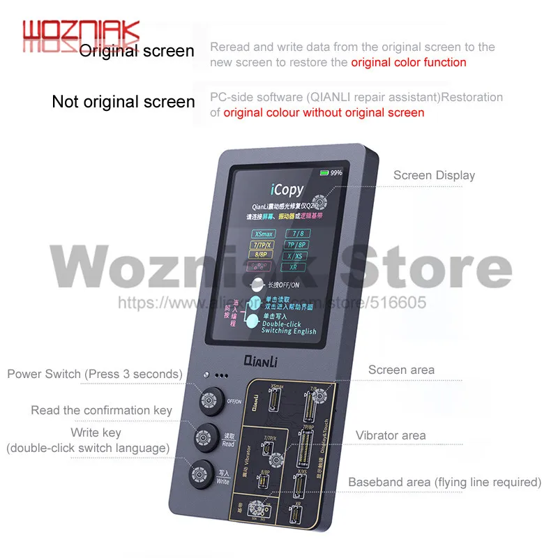 Абсолютно потрясающий продукт, и продавец был очень быстро отправлен товар. Я попробовал передавать функцию истинного тона с оригинального дисплея iPhone XS, и он работает на новом. Это очень просто. Просто положите верные шпильки для кабеля Дисплея на правильный штырь модели и просто нажмите кнопку «Чтение» на старом и напишите на новом.