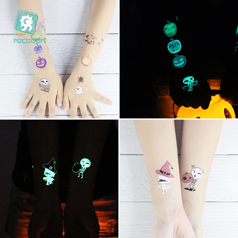 Татуировка Rocooart на Хэллоуин для детей, светящаяся темная татуировка, водонепроницаемая поддельная татуировка, Светящиеся Татуировки, наклейки для боди-арта, Мультяшные татуировки
