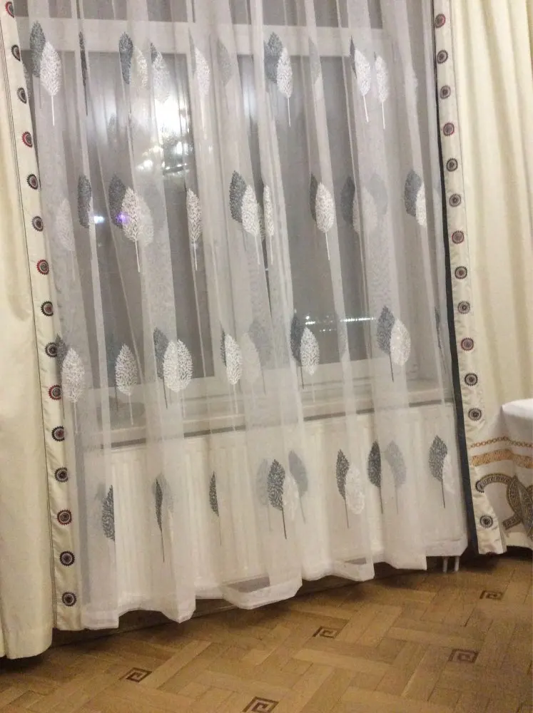 Ожидала, что будет немного поплотнее, но штора хорошая. Вышивка красивая, вставки и длину делают под заказчика, все можно обговорить. Прошито довольно хорошо. Доставка заняла месяц.