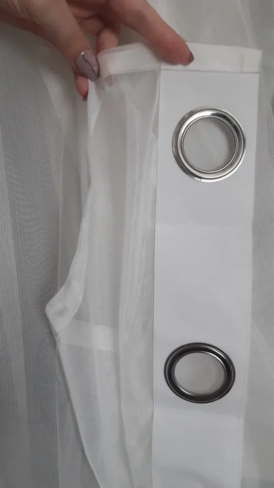 Тюль из мелкой сетки. Люверсы выполнены аккуратно. Единственный нюанс- заказывала шторы и тюль как комплект. Люверсы в шторах белые, в тюли под хром. Отшивали комплект 10 дней. В целом ждала посылку 2 месяца с небольшим