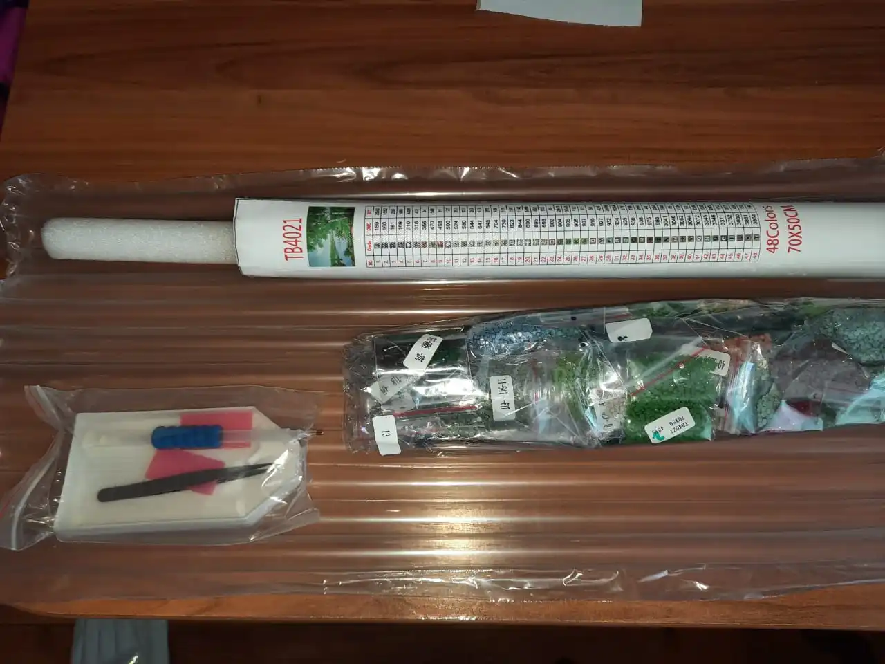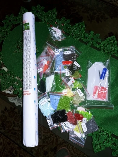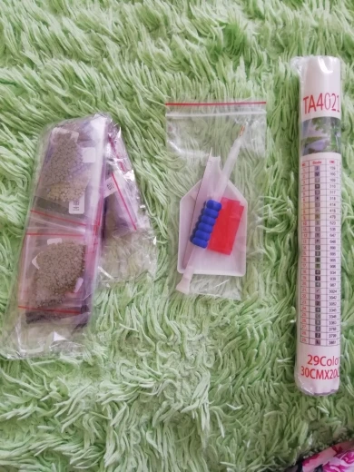 Посылка пришла вовремя. Сама картина упакована в плотный пакет и намотана на валик, размер соответствует 20*30. Сравнила со своими предыдущими картинами это формат А4 в готовом виде получится. Стразинки запакованы в зип пакеты. Трек отслеживался. Спасибо большое продавцу. Буду заказывать еще.