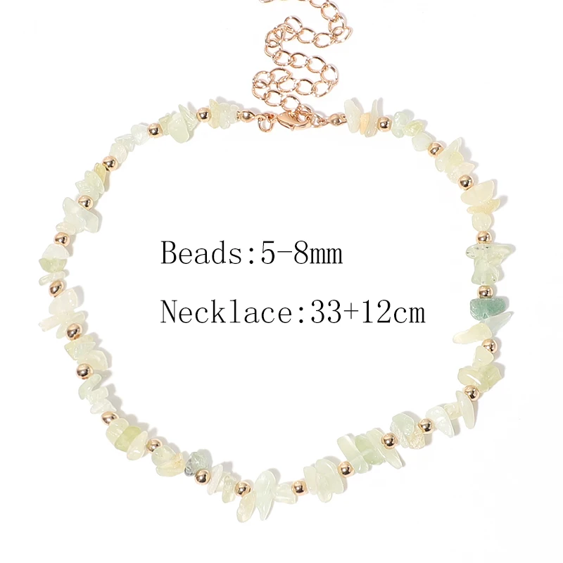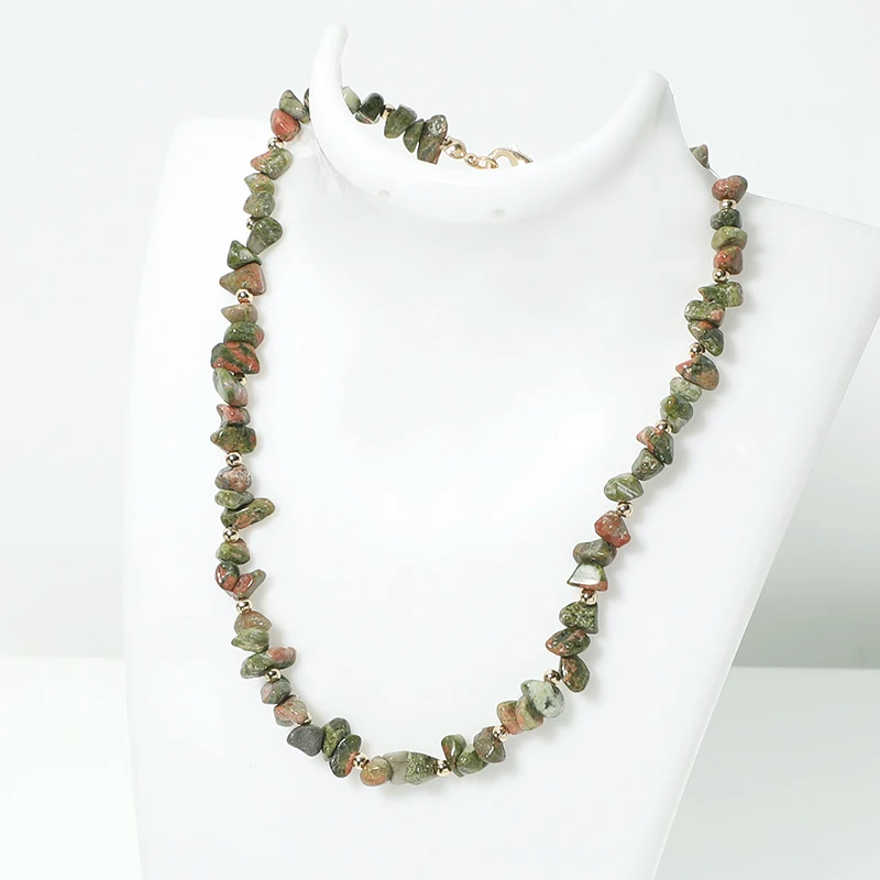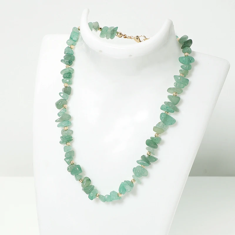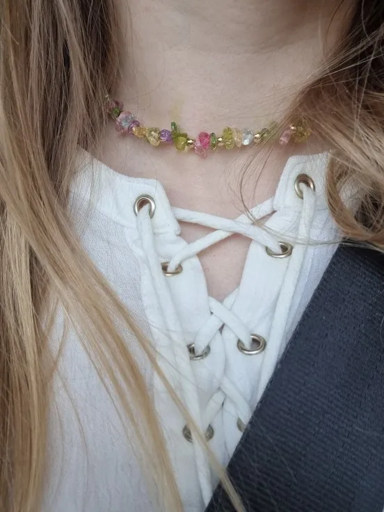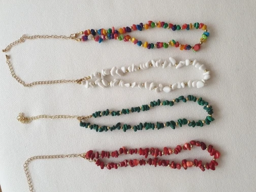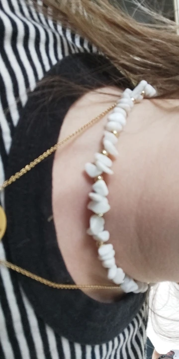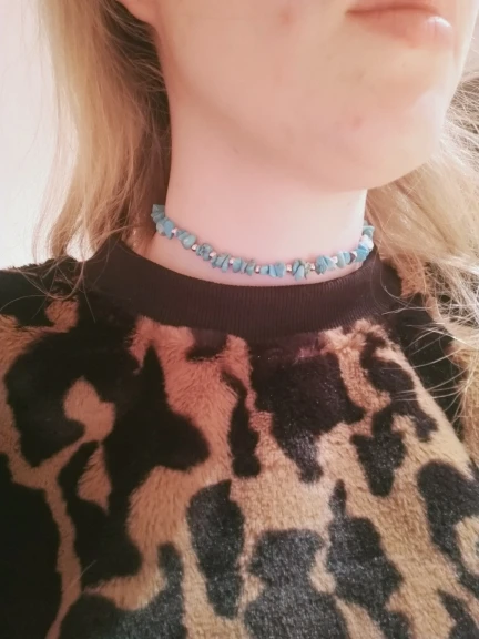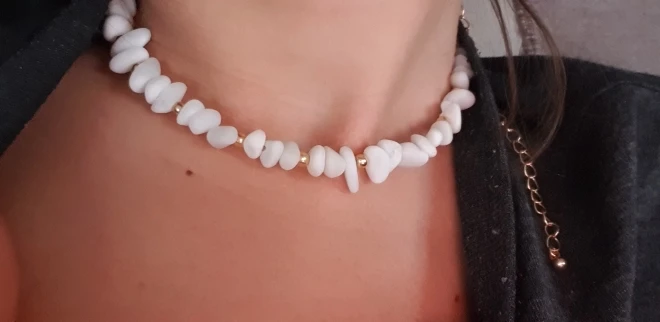Оно хорошее. На шею плотно, как чокер садится. Камни на фото глянцевые, по факту полуматовые и матовые. В данной расцветке универсальность в том, что много оттенков, светлые тона и под много вариантов одежды пойдёт. По факту бежевых кусочков нет вообще, и цвет более темный всей композиции, или даже более зелёный…более логично собрано, цвета не в разброс. Не смотря на мелкие минусы смотрится оно красиво и выглядит не дёшево. Летнее, симпатичное, трендовое. Цепка и замок не хлипкие.