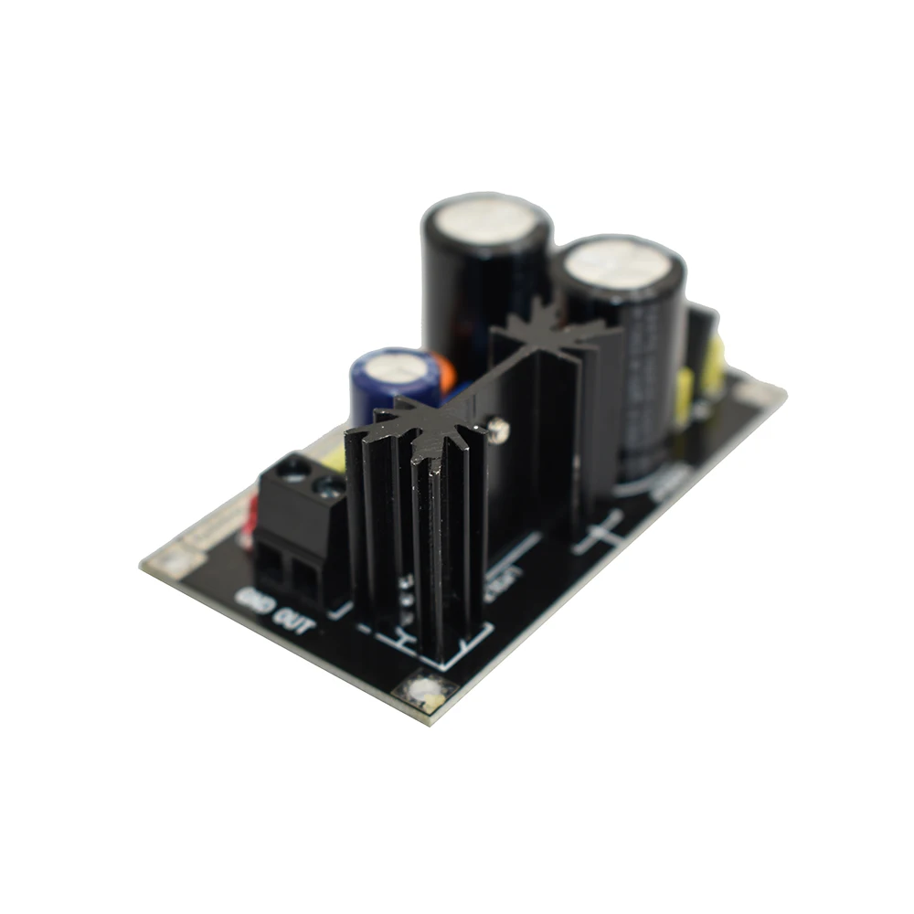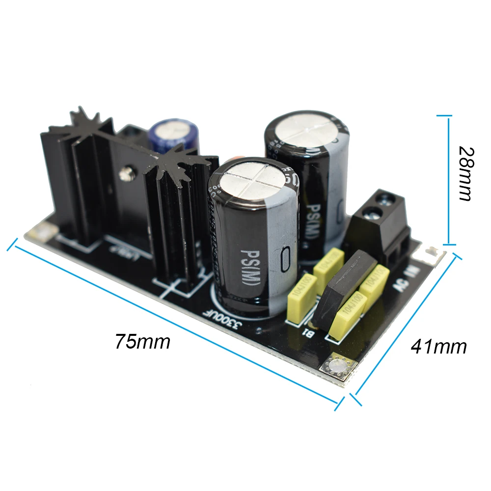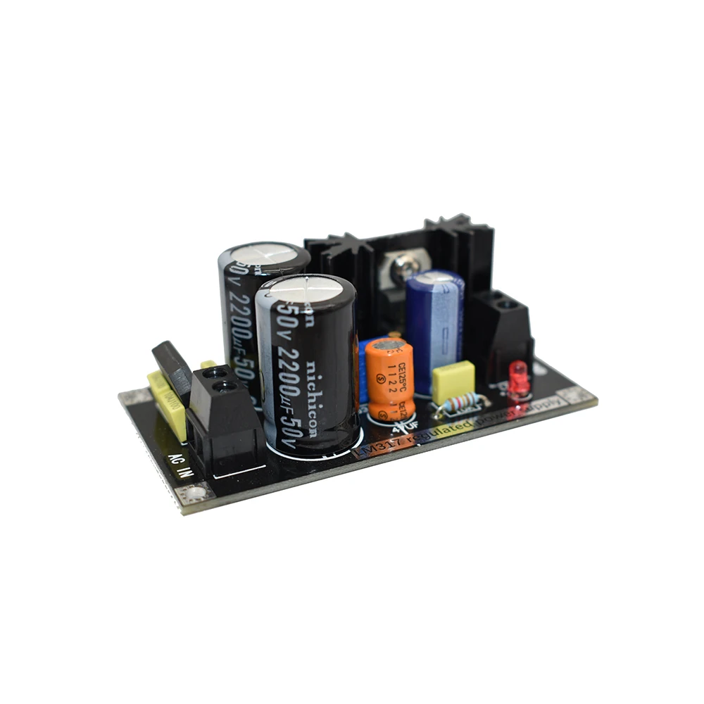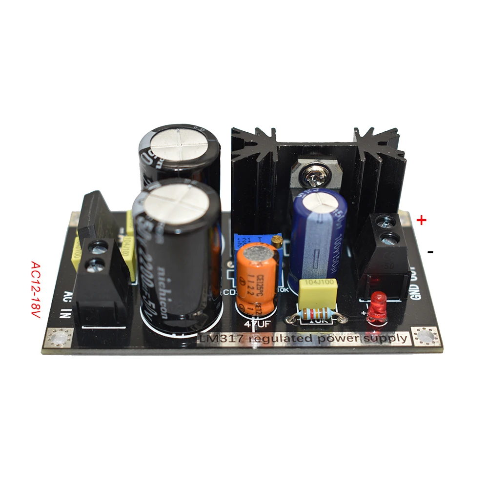 LM317 в качестве доброй воли регулятор, с высокой стабильностью, высокая температура, высокая линейность и другие характеристики, Диапазон выходного напряжения до 1,25 V ~ 37V с плавной регулировкой, максимальный рабочий ток более 1 А (с использованием большого радиатора или активных мер охлаждения). Плата с выпрямительный мост, а также с 3300 мкФ фильтр конденсатор с алюминиевой крышкой, может эффективно уменьшить Пульсация и помех.