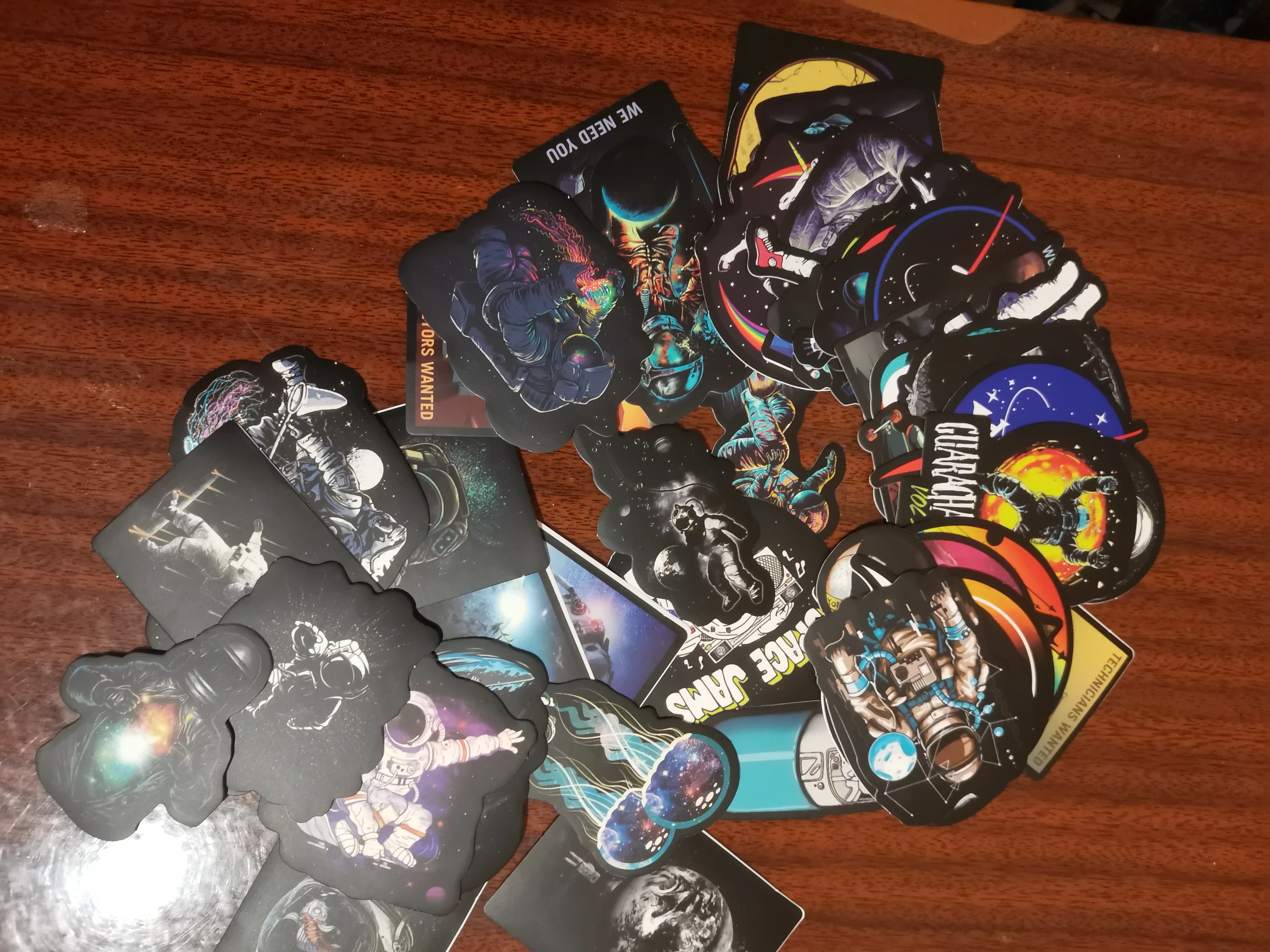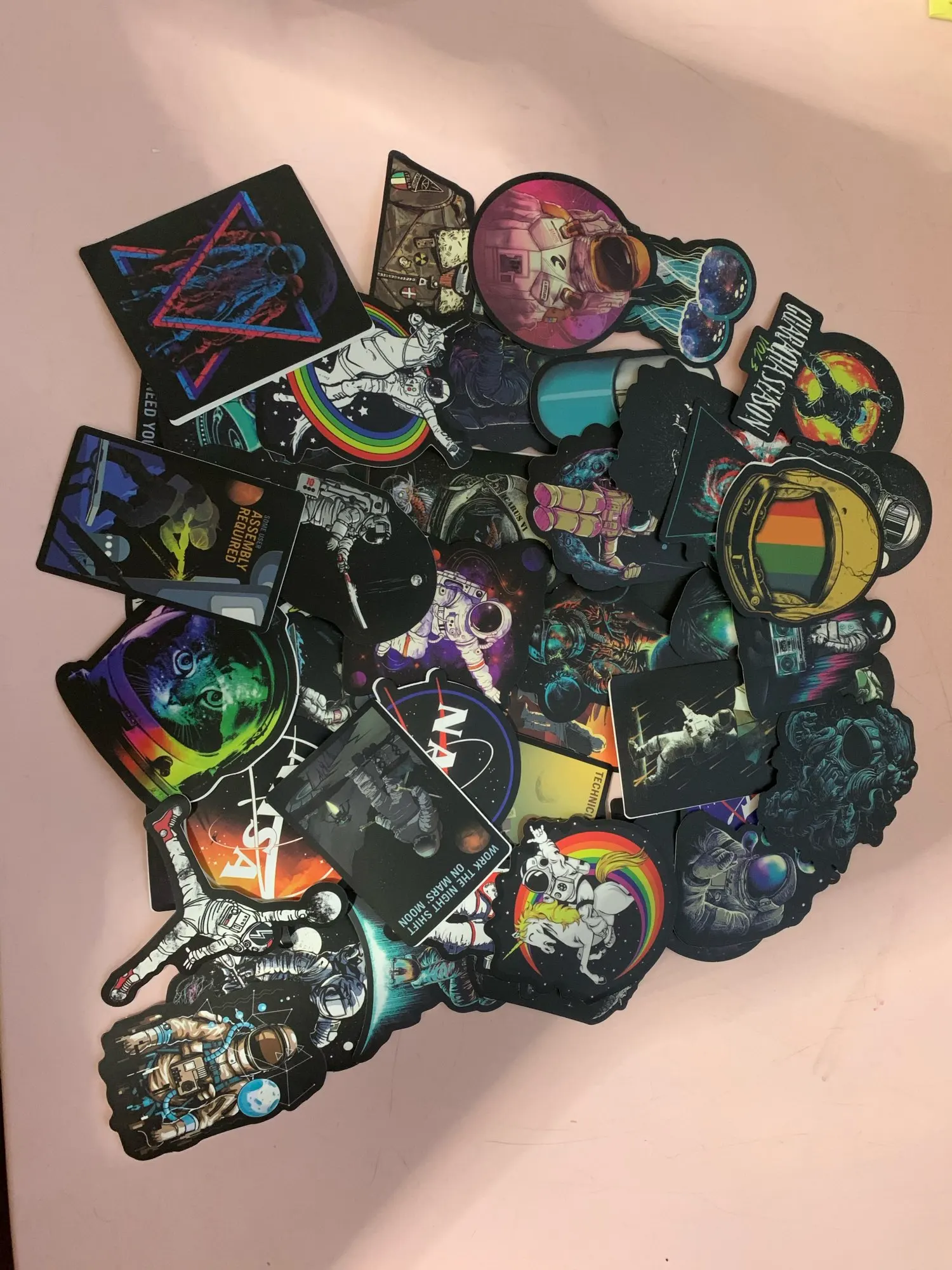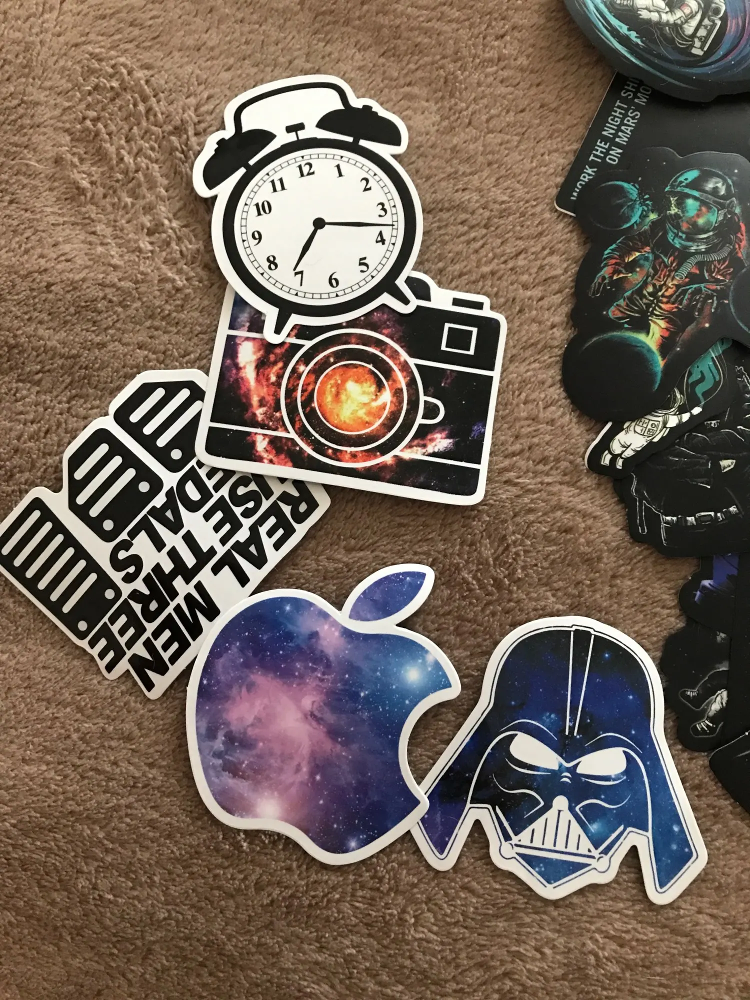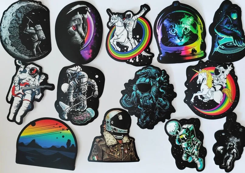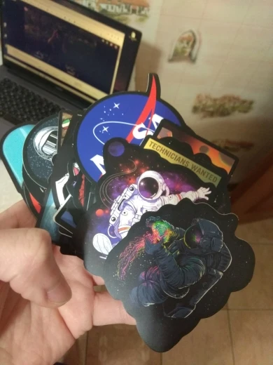 Наклейки без белой обводки, матовые, 50шт, размером см 5-7. Рисунок полностью на черном фоне. абсолютно совпадают с описанием и референсами. Положили в подарок пять наклеек с космическим рисунком. Пришли довольно быстро за 23 дня. Самые лучшие наклейки, которые мне удавалось использовать. Не пожалел, что купил.