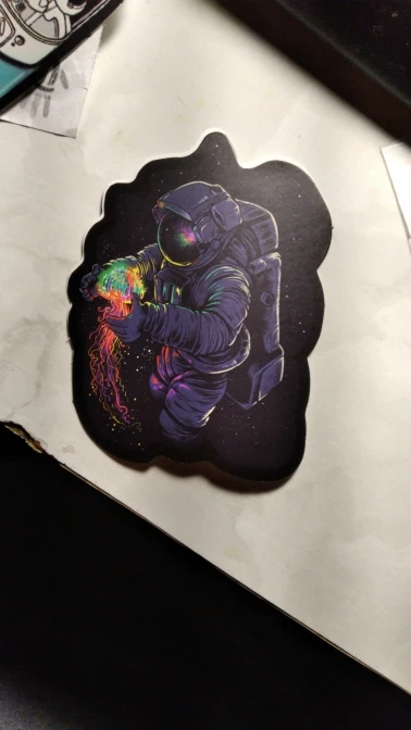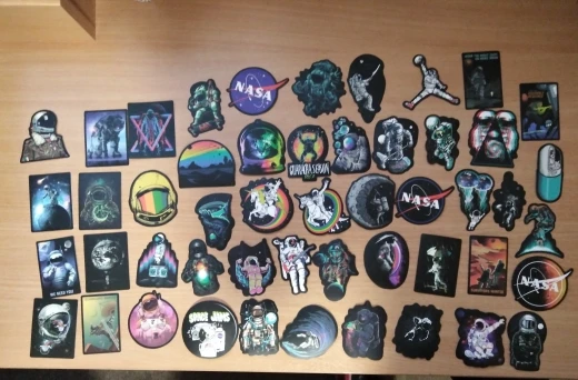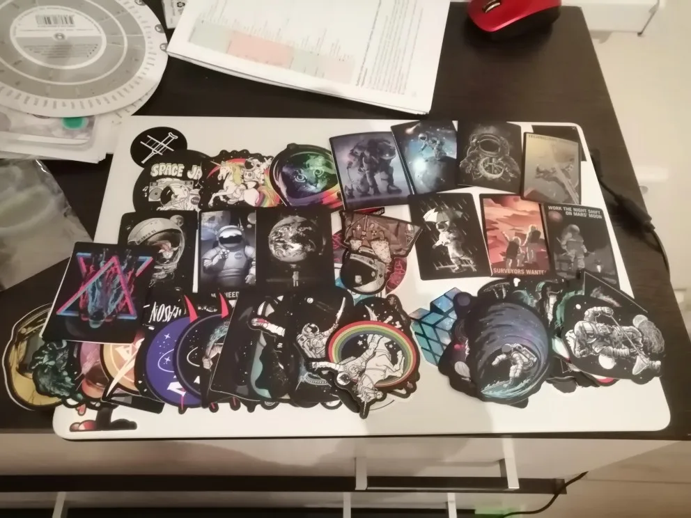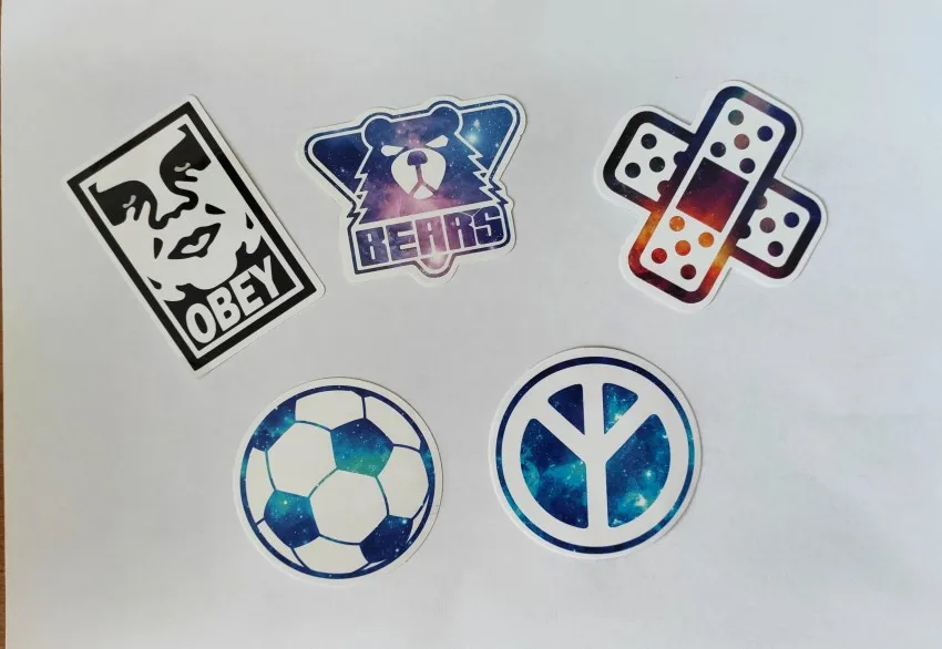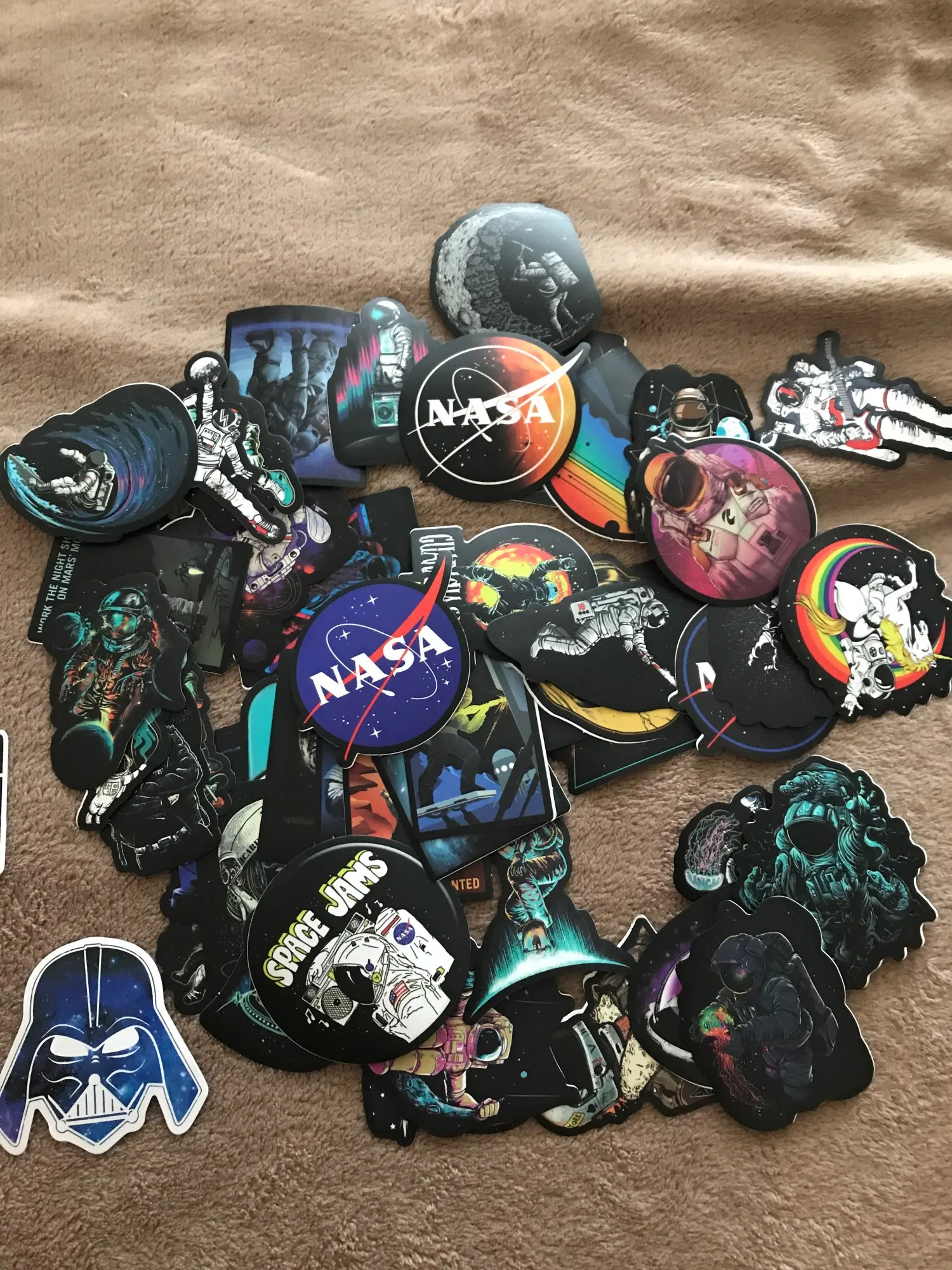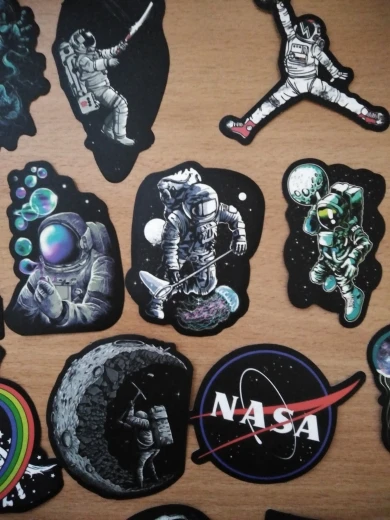 Наклейки без белой обводки, матовые, 50шт, размером см 5-7. Рисунок полностью на черном фоне. абсолютно совпадают с описанием и референсами. Положили в подарок пять наклеек с космическим рисунком. Пришли довольно быстро за 23 дня. Самые лучшие наклейки, которые мне удавалось использовать. Не пожалел, что купил.