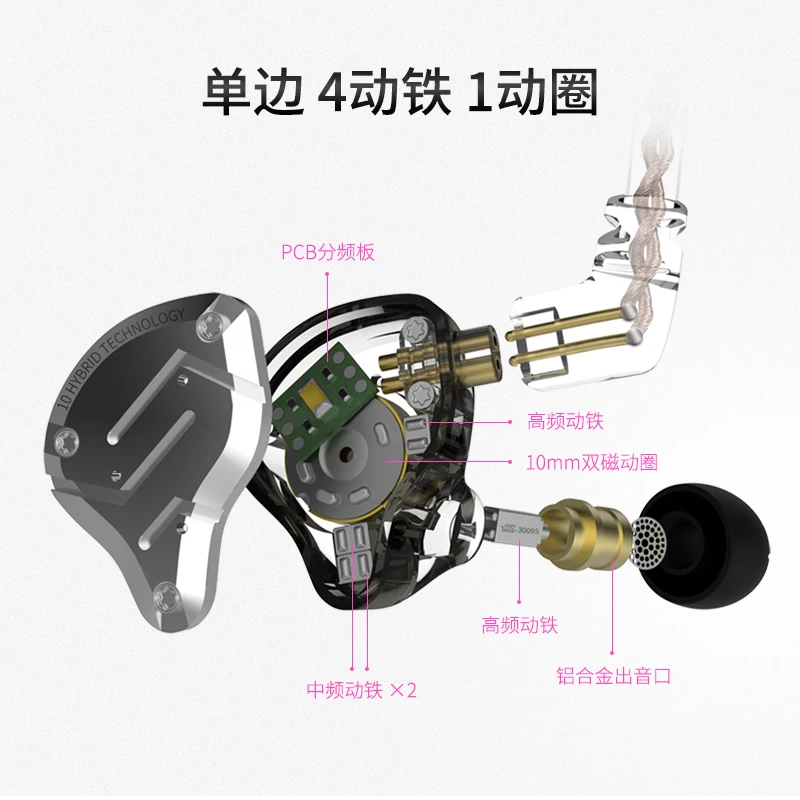 Наушники-вкладыши KZ ZS10 PRO, металлические гибридные наушники 4ba + 1dd, с Hi-Fi передачей басов, монитором и функцией шумоподавления, 2 контакта, для ZSX, 10 шт.