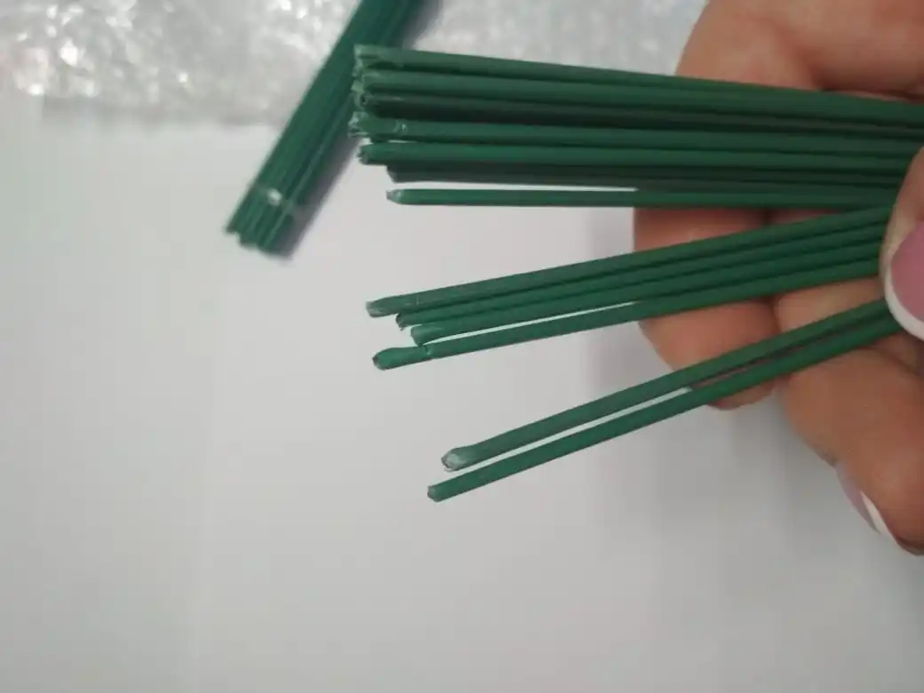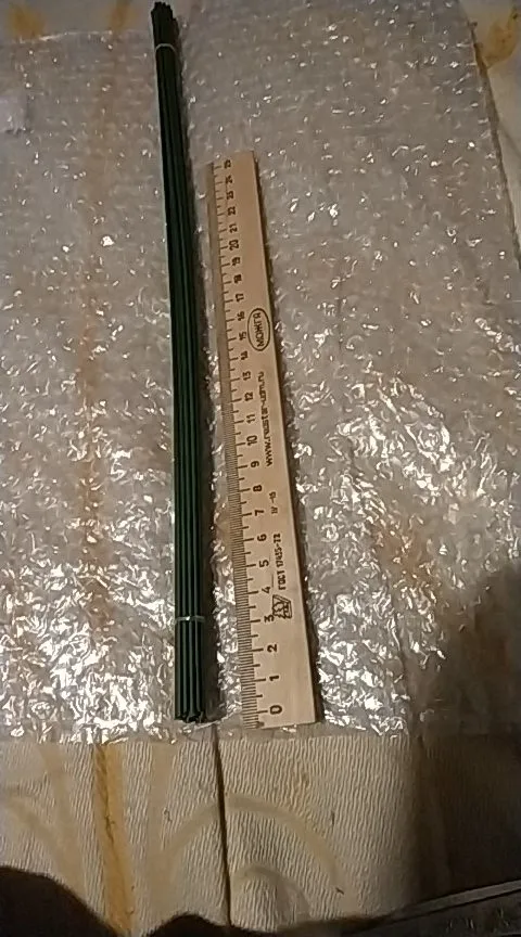 Доставка менее месяца. Упаковано внутри тщательно в пупырку. Проволока липнет к магниту, значит стальная, диаметром около 1,5 мм, сверху покрыта около 0,5 мм слоем зеленого пластика. В целом диаметр около 2 мм. Гнется туго, хорошо удерживая форму. Продавца рекомендую.