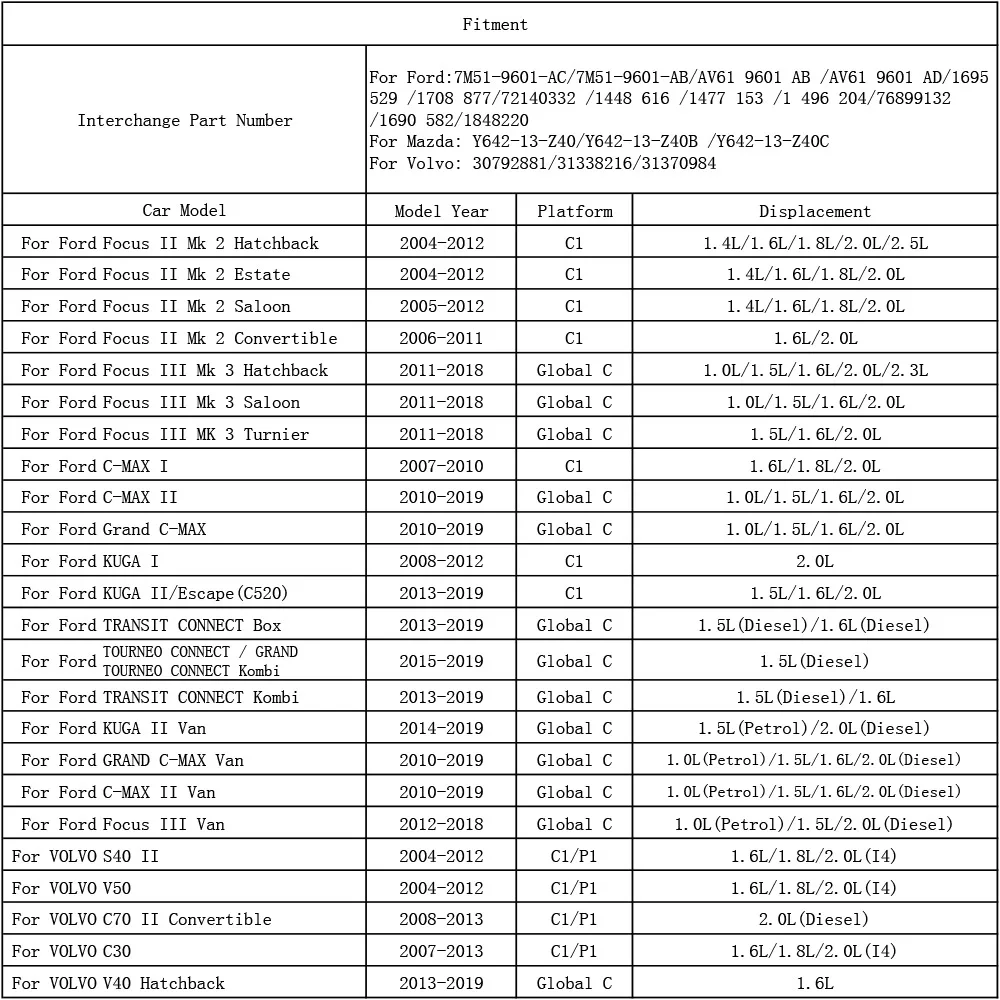 Приспособление:Для Ford Focus MK2 II 2 C1 2004 2005 2006 2007 2008 2009 2010 2011 2012 1.4L 1.6L 1.8L 2.0L 2.5LДля Ford Focus MK3 III 3 Global C 2011 2012 2013 2014 2015 2016 2017 2018 1.0L 1.5L 1.6L 2.0L 2.3LДля Ford C-MAX 2007 2008 2009 2010 2011 2012 2013 2014 2015 2016 2017 2018 2019 1.0L 1.5L 1.6L 1.8L 2.0LДля Ford Grand C-Max Global C 2010 2011 2012 2013 2014 2015 2016 2017 2018 2019 1.0L 1.5L 1.6L 2.0LДля Ford Kuga I C1 2008 2009 2010 2011 2012 2.0LДля Ford Kuga II Escape C520 C1 2013 2014 2015 2016 2017 2018 2019 1.5L 1.6L 2.0LДля Ford Transit Connect Box Global C 2013 2014 2015 2016 2017 2018 2019 1.5L 1.6LДля Ford Tourneo Connect Global C 2015 2016 2017 2018 2019 1.5LДля Volvo S40 II V50 C1 P1 2004 2005 2006 2007 2008 2009 2010 2011 2012 1.6L 1.8L 2.0LДля Volvo C30 C1 P1 2007 2008 2009 2010 2011 2012 2013 1.6L 1.8L 2.0LДля Volvo V40 хэтчбек Global C 2013 2014 2015 2016 2017 2018 2019 1.6L