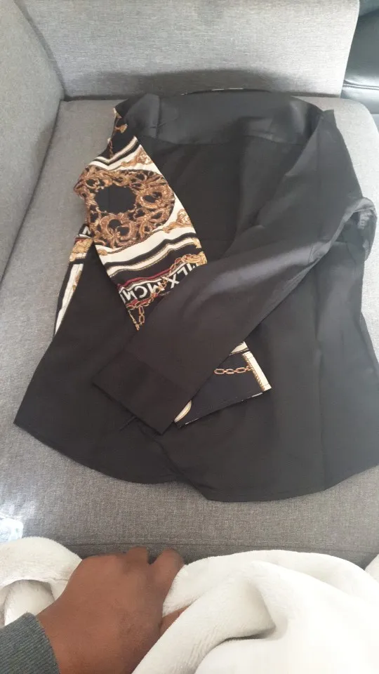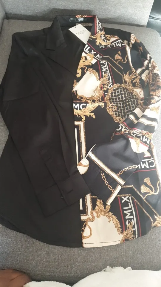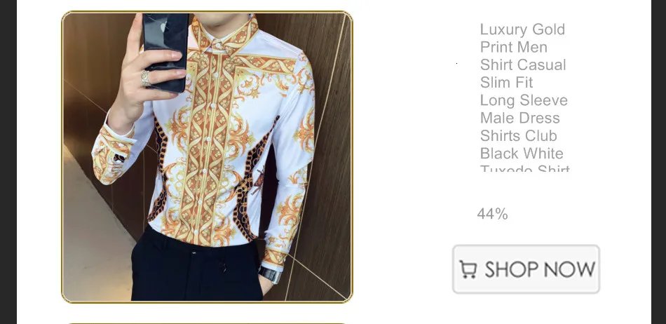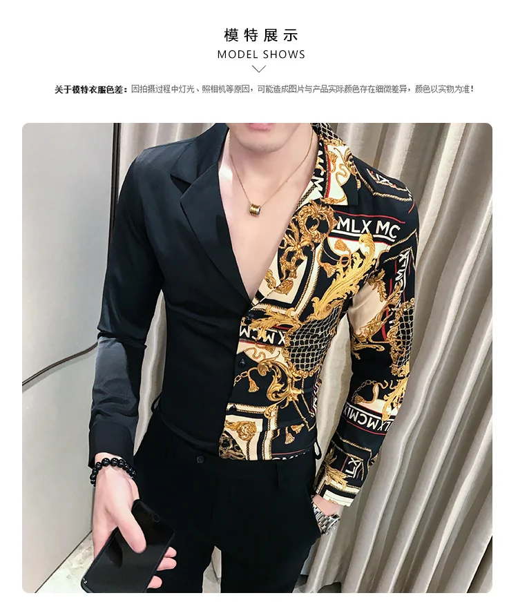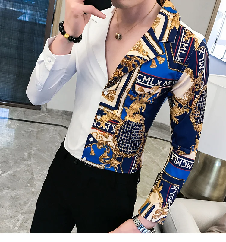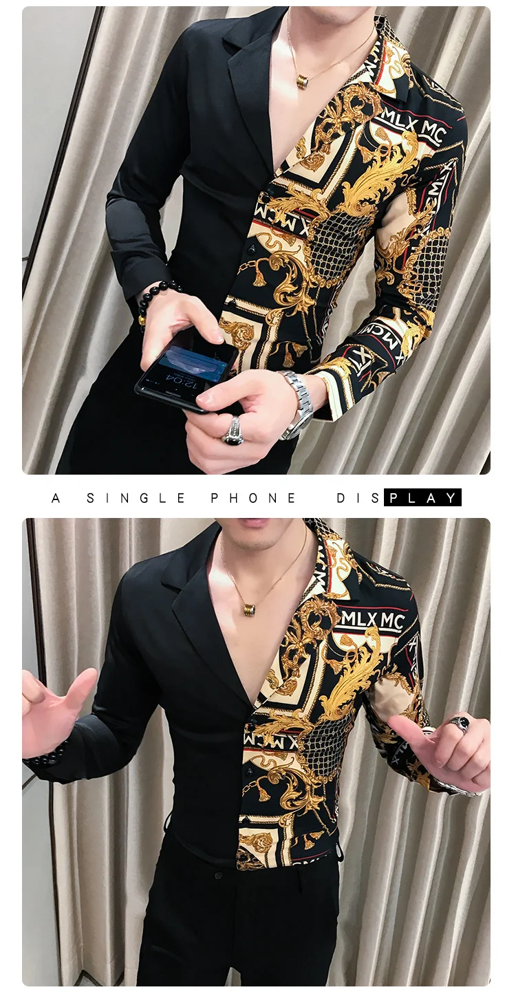 Роскошная Черная Золотая рубашка, 2019, осенние мужские рубашки с длинным рукавом в стиле барокко, Повседневная рубашка в стиле пэчворк, мужские облегающие вечерние рубашки с принтом
