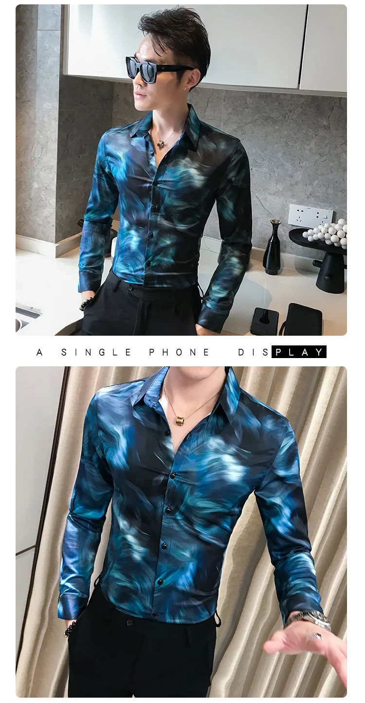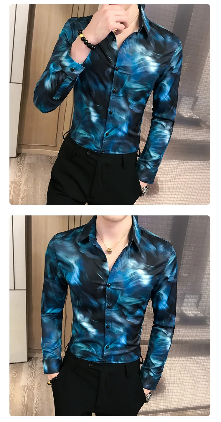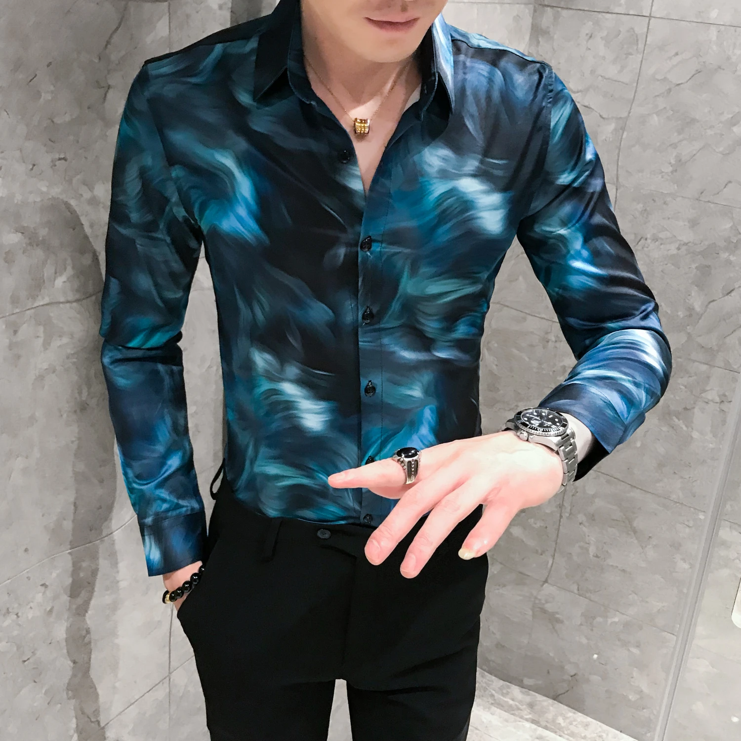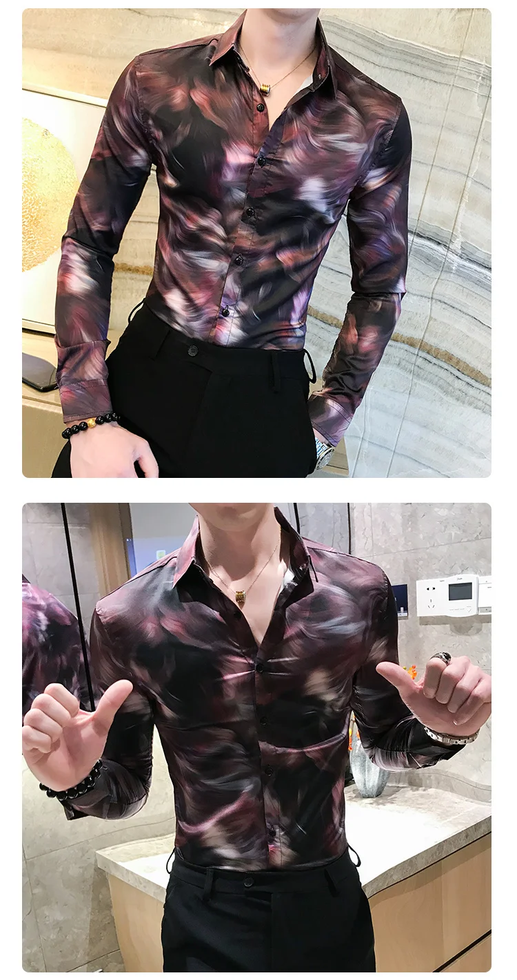 Осенняя мужская рубашка с длинным рукавом и красивым принтом в британском стиле, новая модная повседневная приталенная рубашка, вечерние рубашки, Camisa Homem