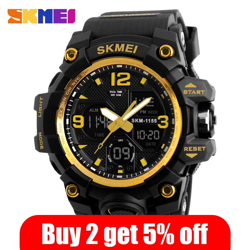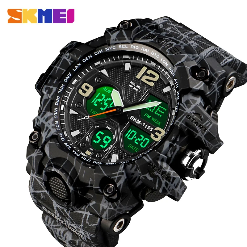 SKMEI с 2 временными Для мужчин Мужская watche мужские электронные спортивные часы секундомер задней светильник сигнализации Водонепроницаемый кварцевые часы reloj hombre 1155B