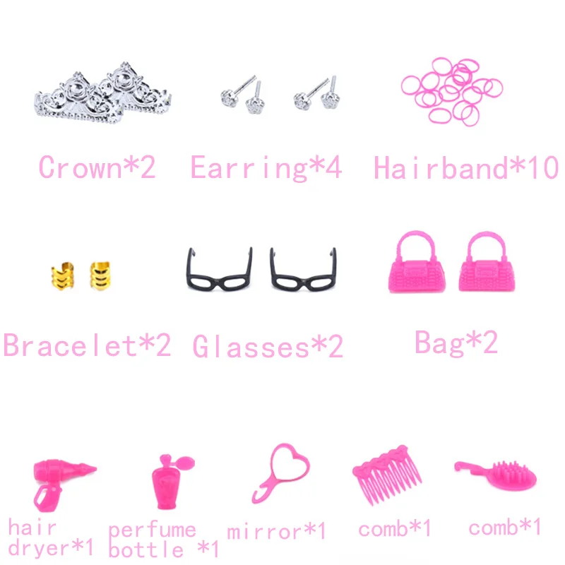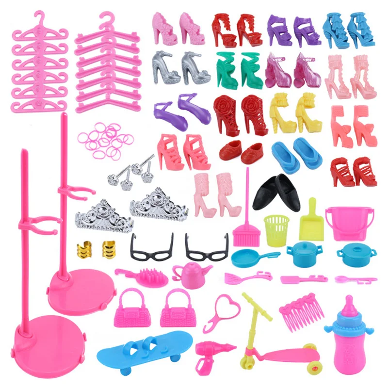 73 предметанабор, аксессуары для кукол = 18 туфель + 23 аксессуара для волос + 16 мебели для кукольного домика + 12 вешалки + 2 очки + 2 сумки для куклы Барби