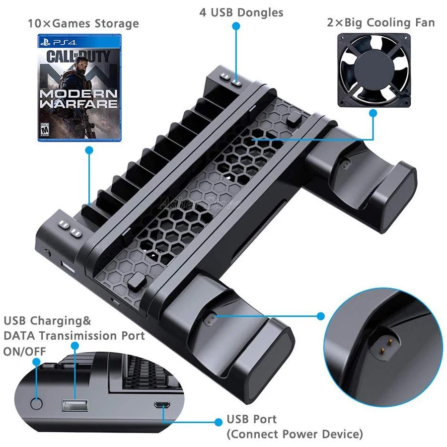 【 Многофункциональность «Все в одном» 】:Консоль вертикальная подставка + 2 охлаждающих вентилятора + Двойная зарядная станция для контроллеров + usb-порт + светодиодный контроллер для зарядки + 10 игровых накопителей
