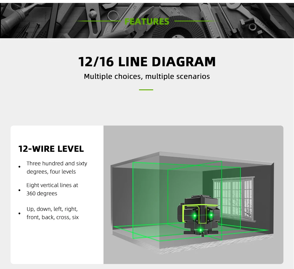 Лазерный уровень с 1612 линиями 4D, зеленый луч, сверхмощный горизонтальный и вертикальный лазерный уровень с 360 горизонтальными и вертикальными линиями, лазерный уровень с зеленым лучом