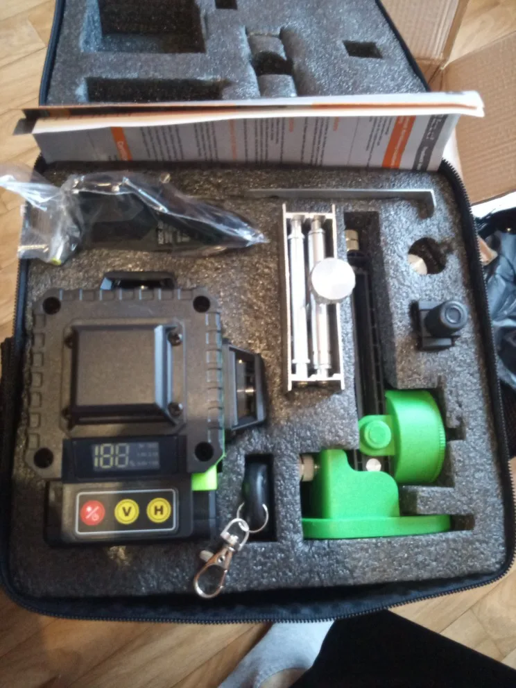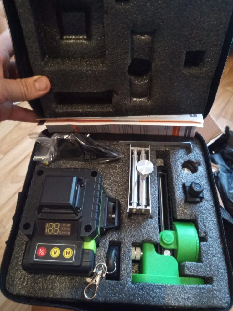 Всё получил спасибо большое за проверку, быструю отправку. Нивелир просто супер, в работе незаменимый помощник. Нижнее расположение лазера просто чудо, от пола 7мм,для стяжки, для укладки плитки!!! А верхнее для любых видов потолков!!! Берите не пожалеете!!! Продавца и доставку рекомендую!!! Кстати на пульте есть штрих код, приложение для смартфона, можно и с помощью телефона управлять. Всем здоровья и удачи!!!