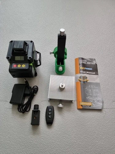 Нивелир на 16 линий, очень хороший яркий луч. Возможность регулировки яркости, пультик, металлическая плашка, кронштейн с магнитом, переходник на большие держатели, крепление за крышку, зарядное устройство, съёмная батарейка. Пластик на ощупь приятный, есть резиновая накладка на корпусе. Всё призмы закрыты пластиком, чехол с эва всё плотно сидит. С Москвы до Заб. края пришёл целый хорошо упакованный за 14 дней. Продавец общительный ответил на 100 вопросов и помог с выбором. Рекомендую как продавца так и товар.