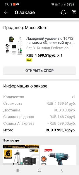 Заказ доставлен в Калининград за две недели. Долго отправляли, а потом посылка доехала за пару дней. Доставляла компания "DPD". Отслеживался. Внешне все нормально. Кофр для нивелира и мелких деталей просто великолепен, а вот штатив хлипкий. Покупать штатив не советую - одноразовый. Аппарат приехал заряженный, и пульт, кстати, тоже. Всё работает. Проверю точность прибора и дополню отзыв. Спасибо Продавцу!