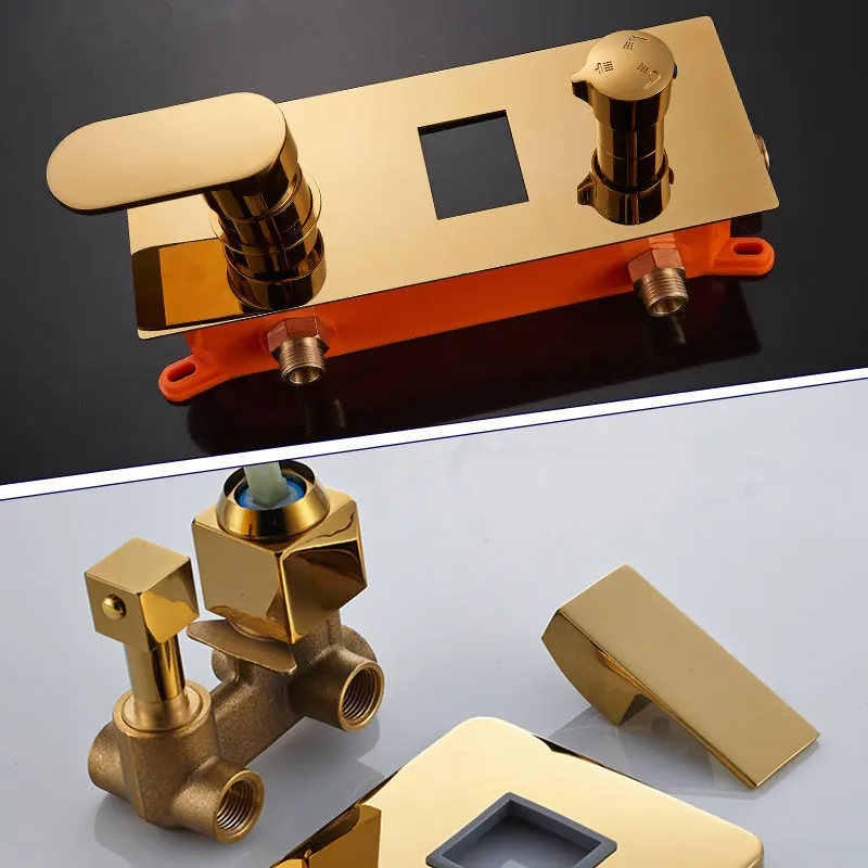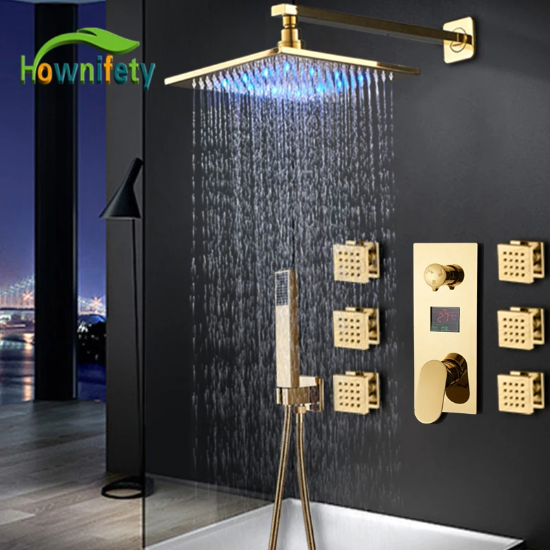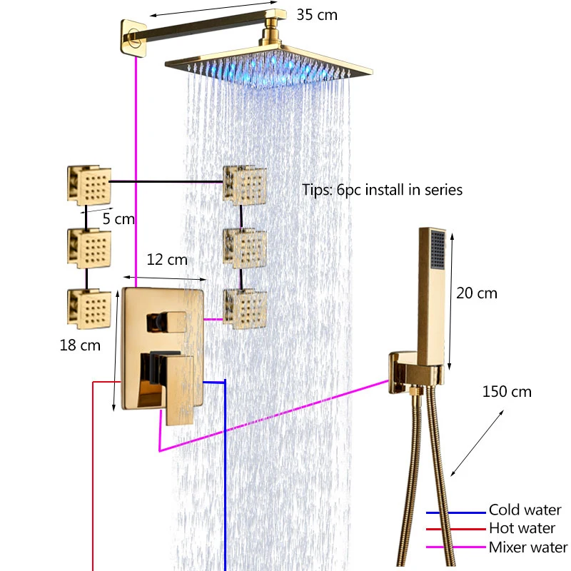 Роскошный золотистый светодиодный набор для душа, смеситель горячей и холодной воды, толщина латунной душевой лейки, два типа, кран для ванной комнаты, 3 направления