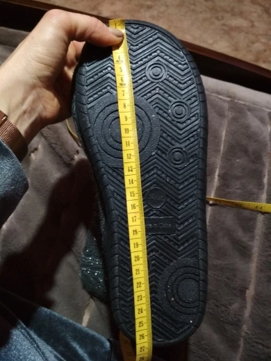 Очень тёплые мягкие и удобные зимние тапочки. Мой размер ноги 22,5 см, заказала 39-40.Подошва 27.см.Хотела,что бы хорошо с запасом были на очень толстый носок. Так и получилось. Они очень широкие, но и на голой ноге они держатся хорошо,не спадают. Я их так ждала, они классные. Подошва резиновая, толстая.