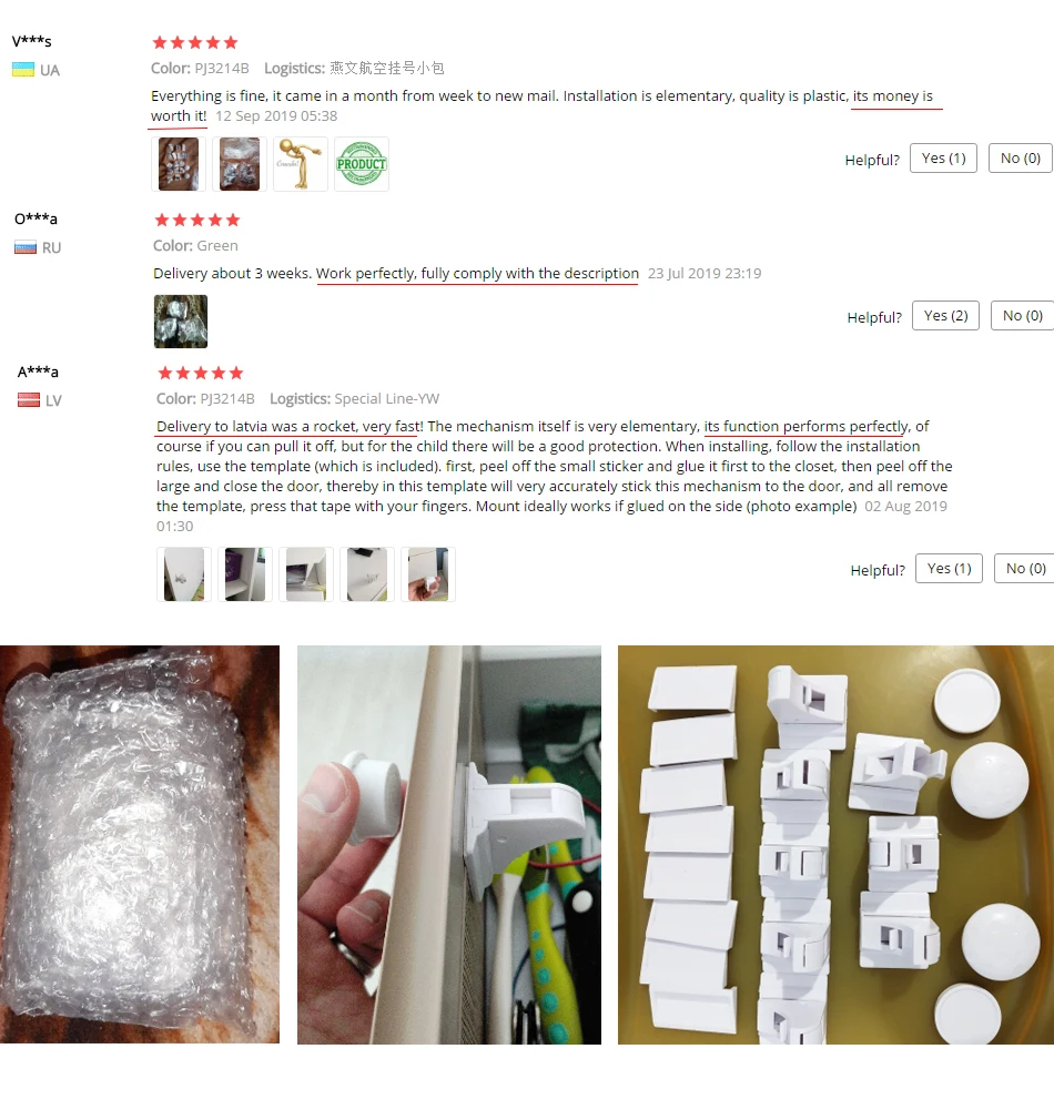 отличная защита на шкафы от детей! в первый вечер даже муж не смог открыть ящик и не понимаб, в чем подвох - вырвать ребенку - нереально. всем знакомым с детками уже посоветовала. заказывала из РФ, доставили за 2 дня в соседний дом. очень довольна. однозначно рекомендую!