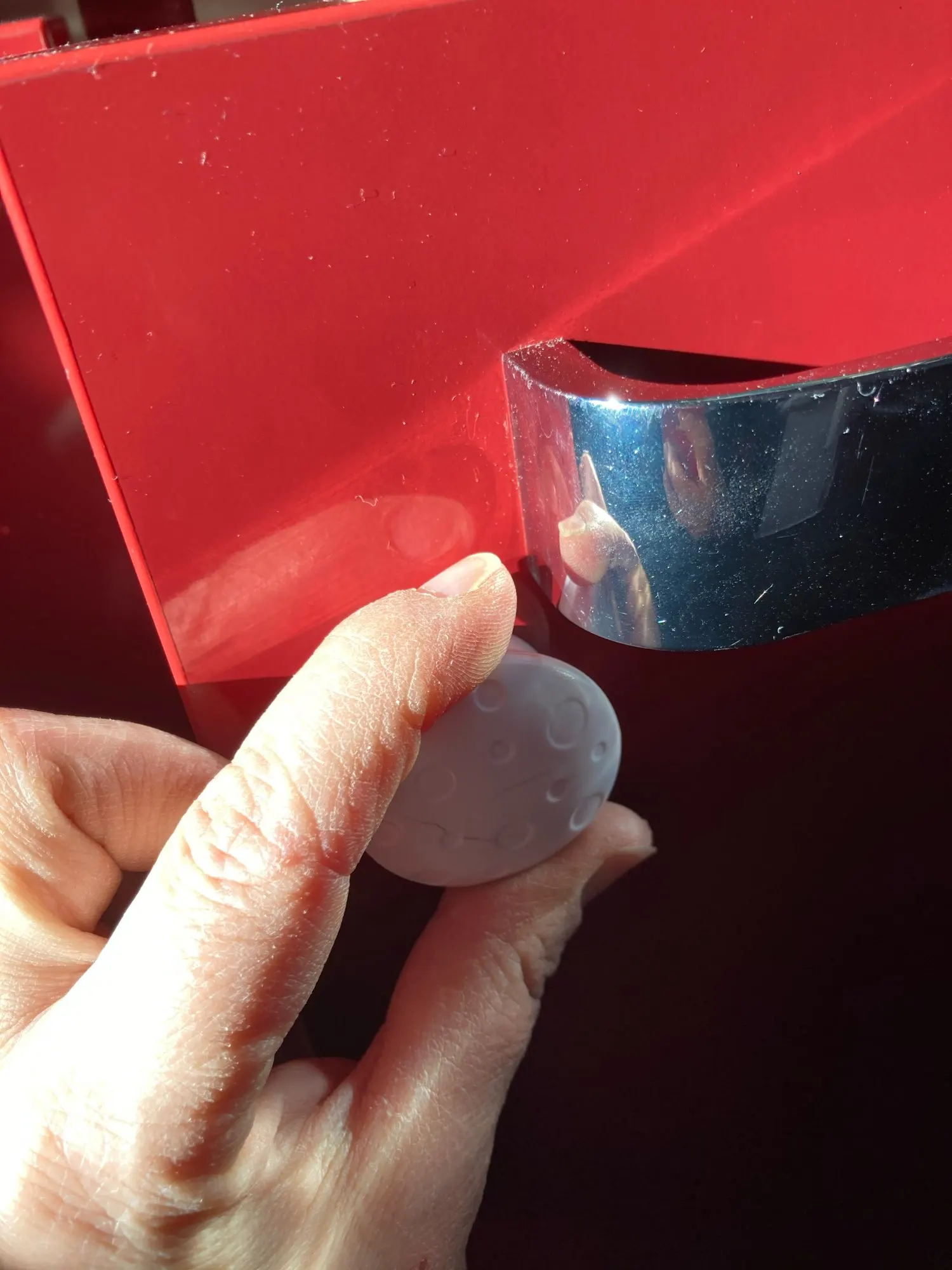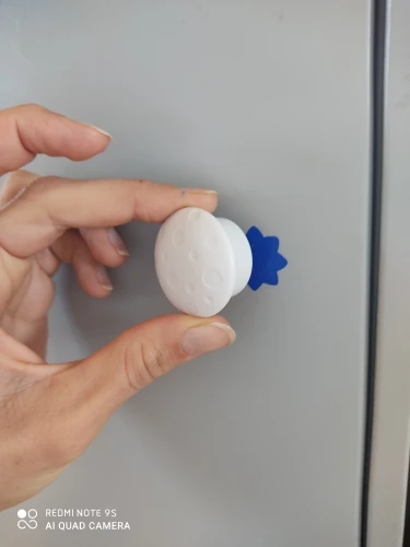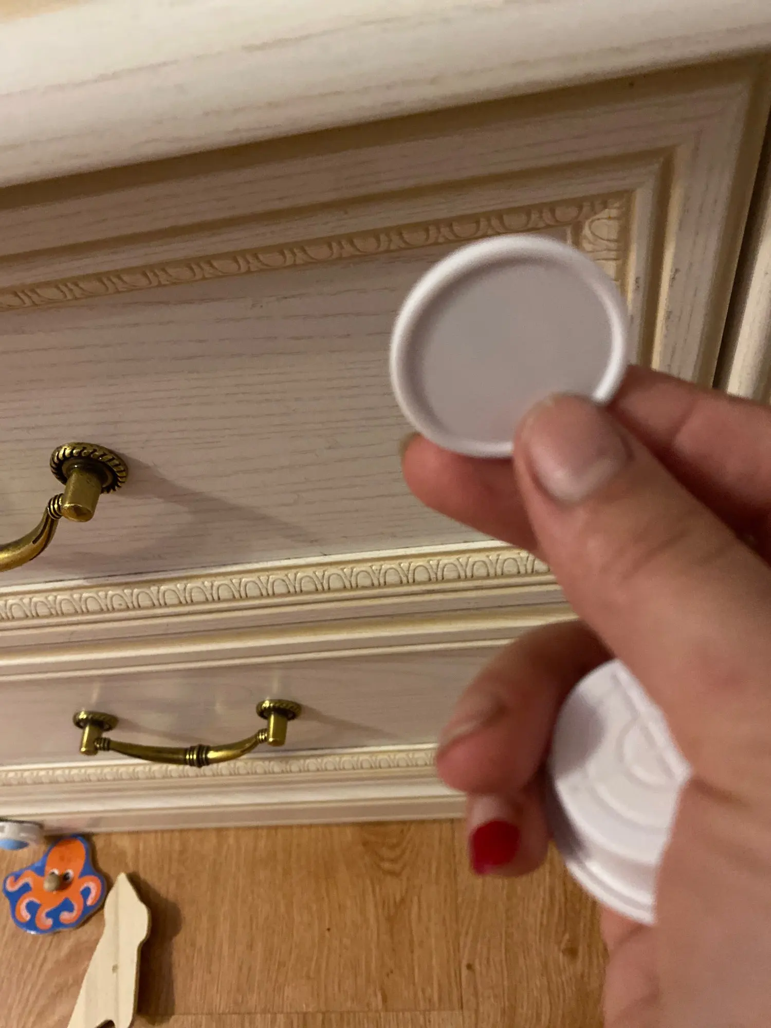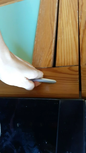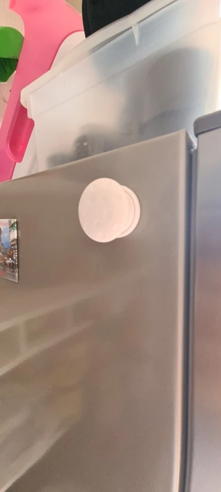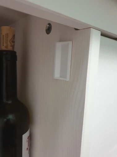Отличная штуковина! Покупаю 2й раз. Держит отлично, хоть и на скотче 3M. Монтируется за секунды внутрь и её снаружи не видно. Но мы специально наклеили войлочные кружки для ножек мебели из IKEA, чтоб было видно куда подносить магнит + чтоб глянцевая краска не царапалась на фасадах кухни. (см фото)