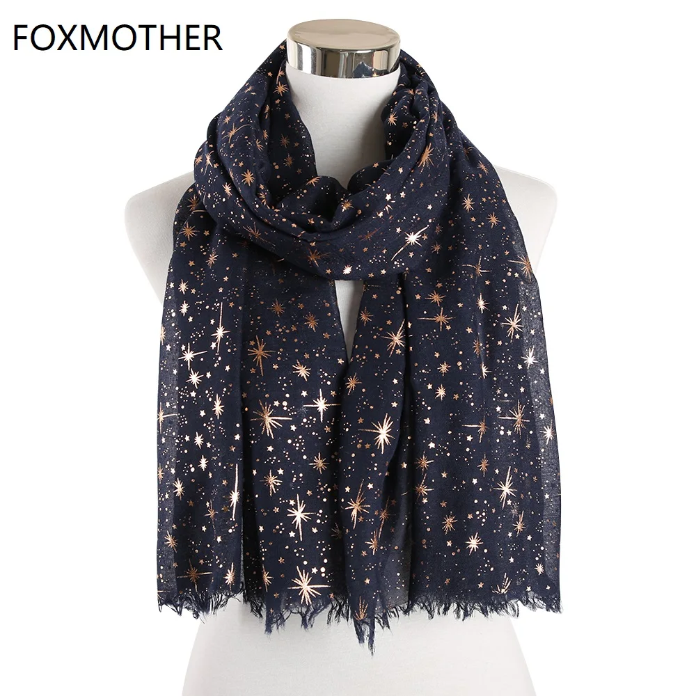 Женский хиджаб FOXMOTHER, розовый и темно-синий шарф с принтом звезд, серебристый хиджаб из фольги, блестящий Галактический шарф, 2019
