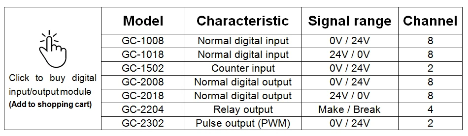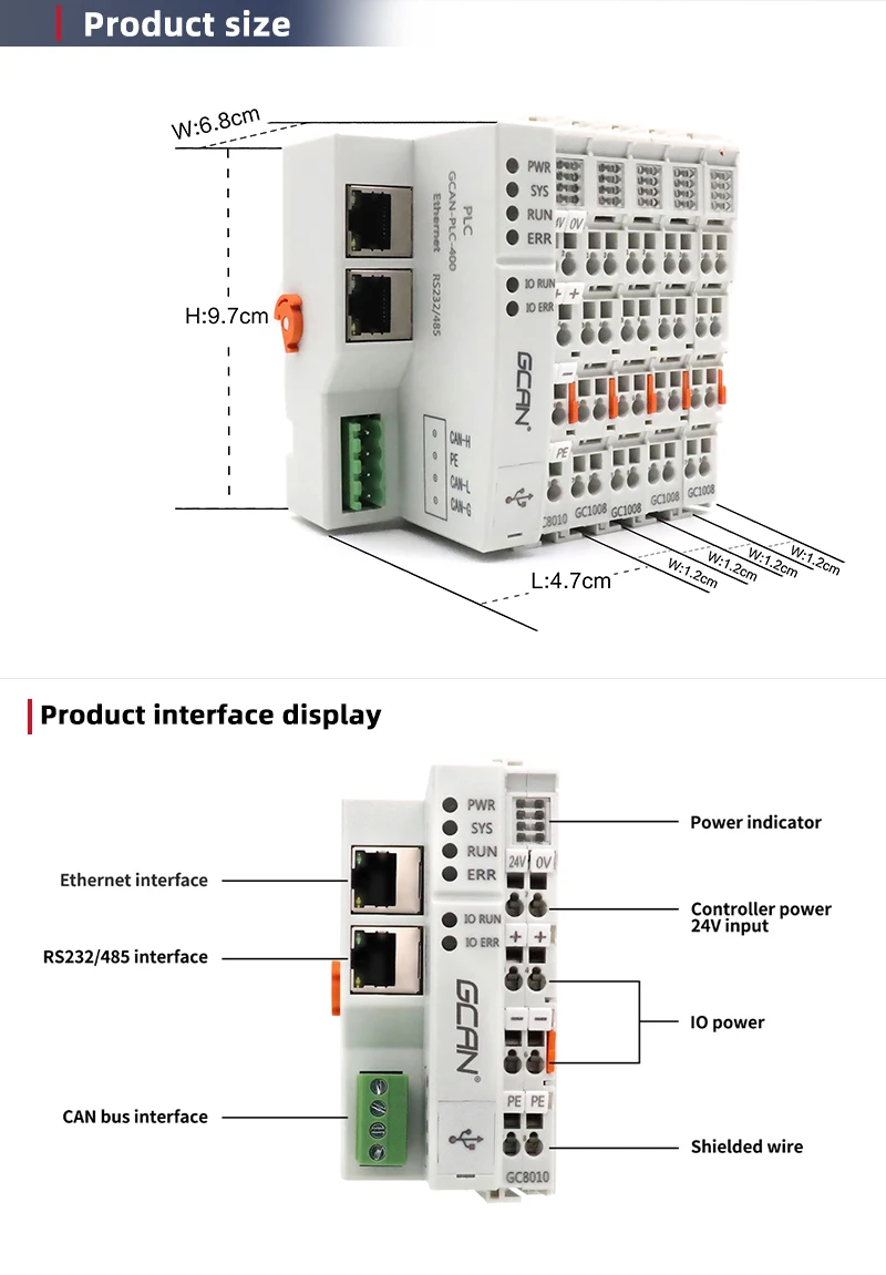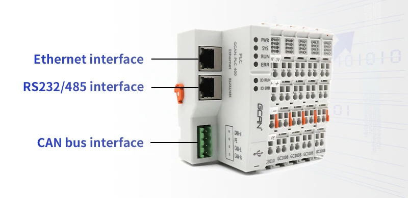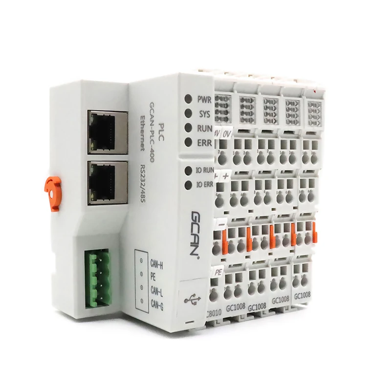 GCAN-PLC модуль состоит из программируемого модуля управления (GCAN-PLC-400/510/511) и нескольких модулей ввода/вывода (GC-1008/2008/...). Модуль управления использует высокоскоростной процессор и обладает мощной вычислительной и обрабатывающей способностью. Модуль управления также имеет различные интерфейсы связи на местах, которые пользователи могут использовать для подключения к соответствующей сети и общения с другими устройствами.