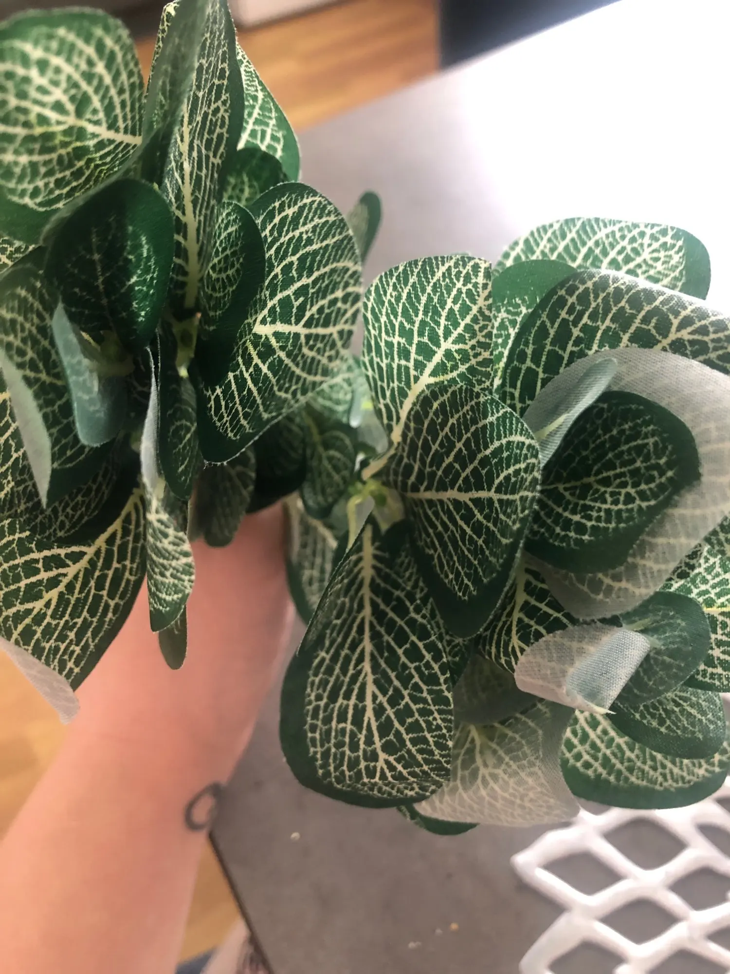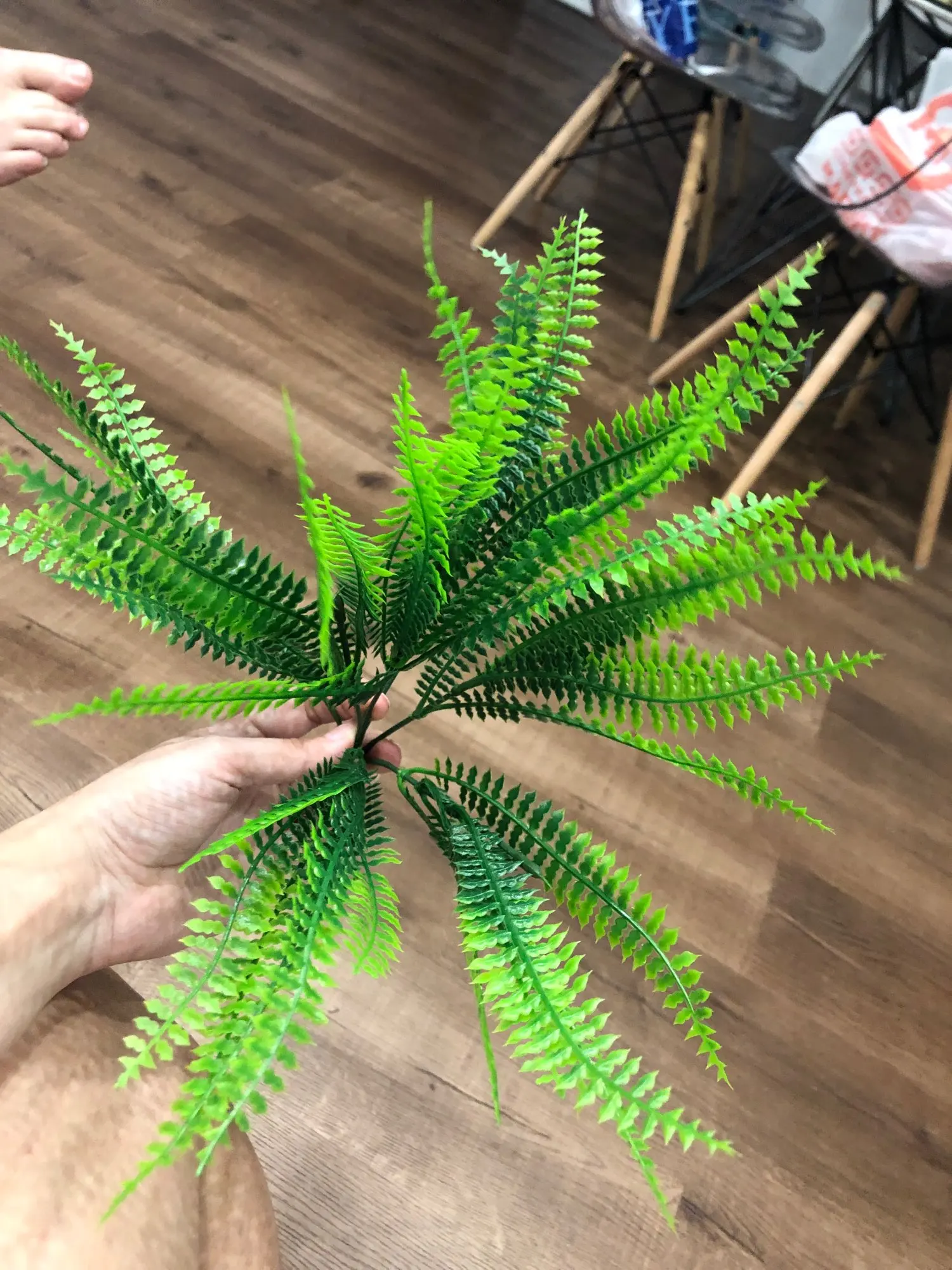 Почти ровные листочки, веток 5ть на каждой веточке по пять веточек с листочкам.запаха нет. Всё как на картинке и в описание.