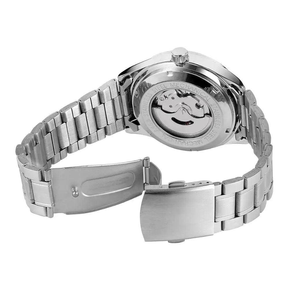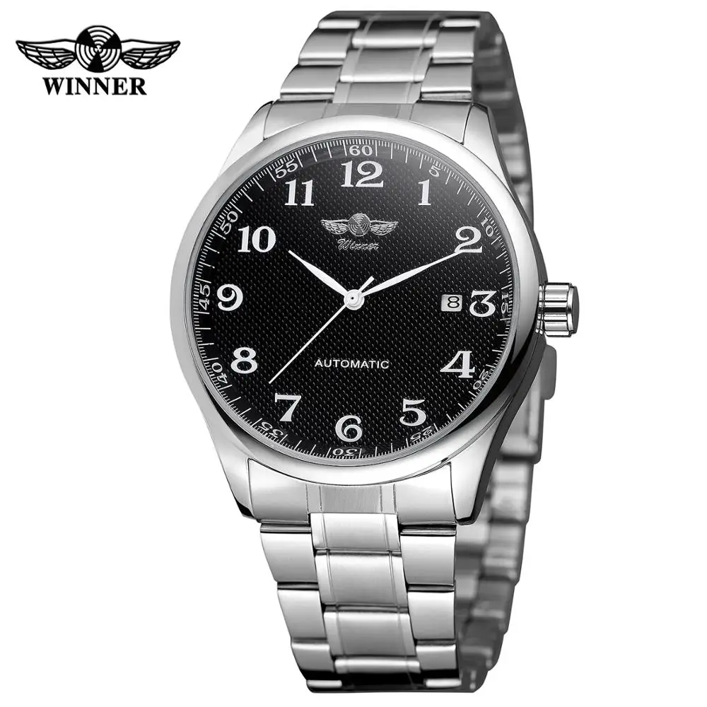 Наручные часы WINNER g с полностью черной поверхностью с уникальной серебряной указкой и серебряным стальным ремешком, Мужские автоматические часы