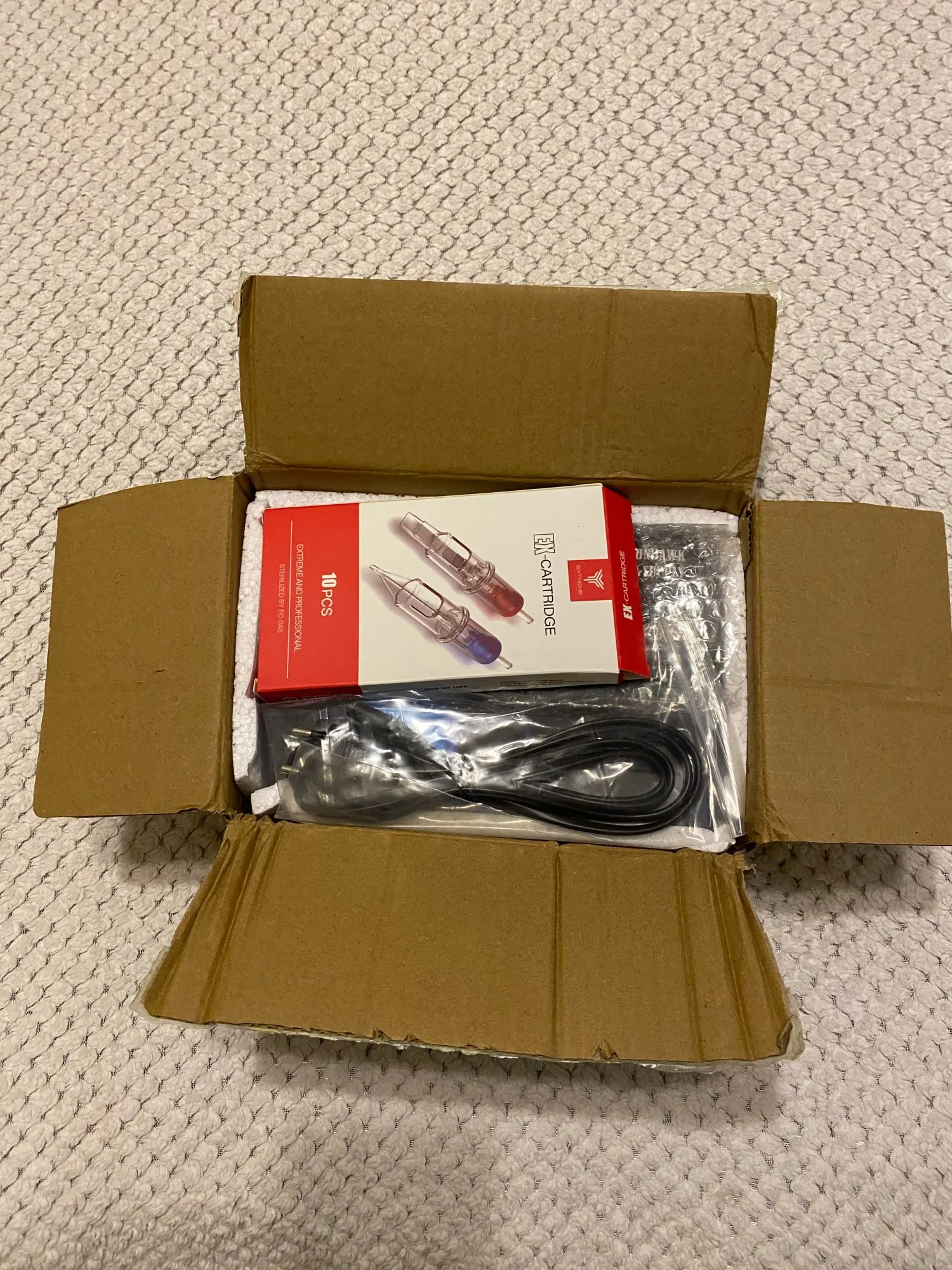 Шло в Киев полтора месяца, я уже начала нервничать, посылка не отслеживалась. Два набора картриджей на 3 и 5 игл с последовательным соединением (плоские). На фото есть ещё красная коробка с иглами, их я заказывала отдельно у этого же поставщика. Всё проверю - оставлю ещё один отзыв.