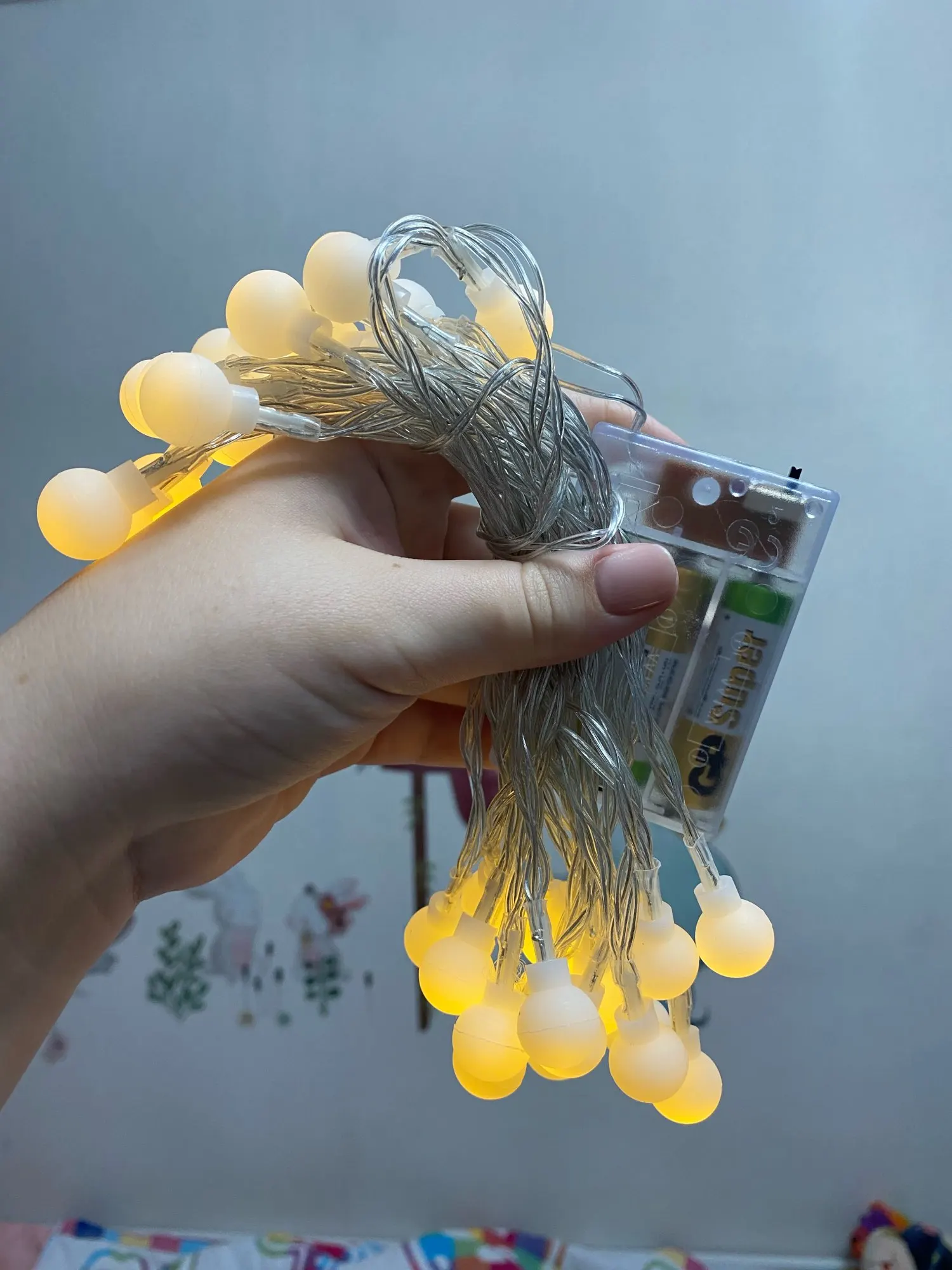 Гирлянда прекрасная, шарики держатся крепко, ничего отпадать не будет.Доставка довольно быстрая - 12 ноября заказала, 18 отправили, 9 декабря пришло. С продавцом не общались. Питание от трёх батареек - блок для них достаточно крепкий. Есть два режима - мигание и постоянный свет. Светит приятным тёплым цветом (на камере ярче, в жизни цне так ярко), спокойно можно закрепить (в моём случае на канцелярские кнопки, скотчем побоялись). Идеально для создания уюта в комнате, это мой первый заказ и я полностью довольна ним. (извиняюсь за кривизну, никогда до этого не занималась креплением гирлянд на стену.)