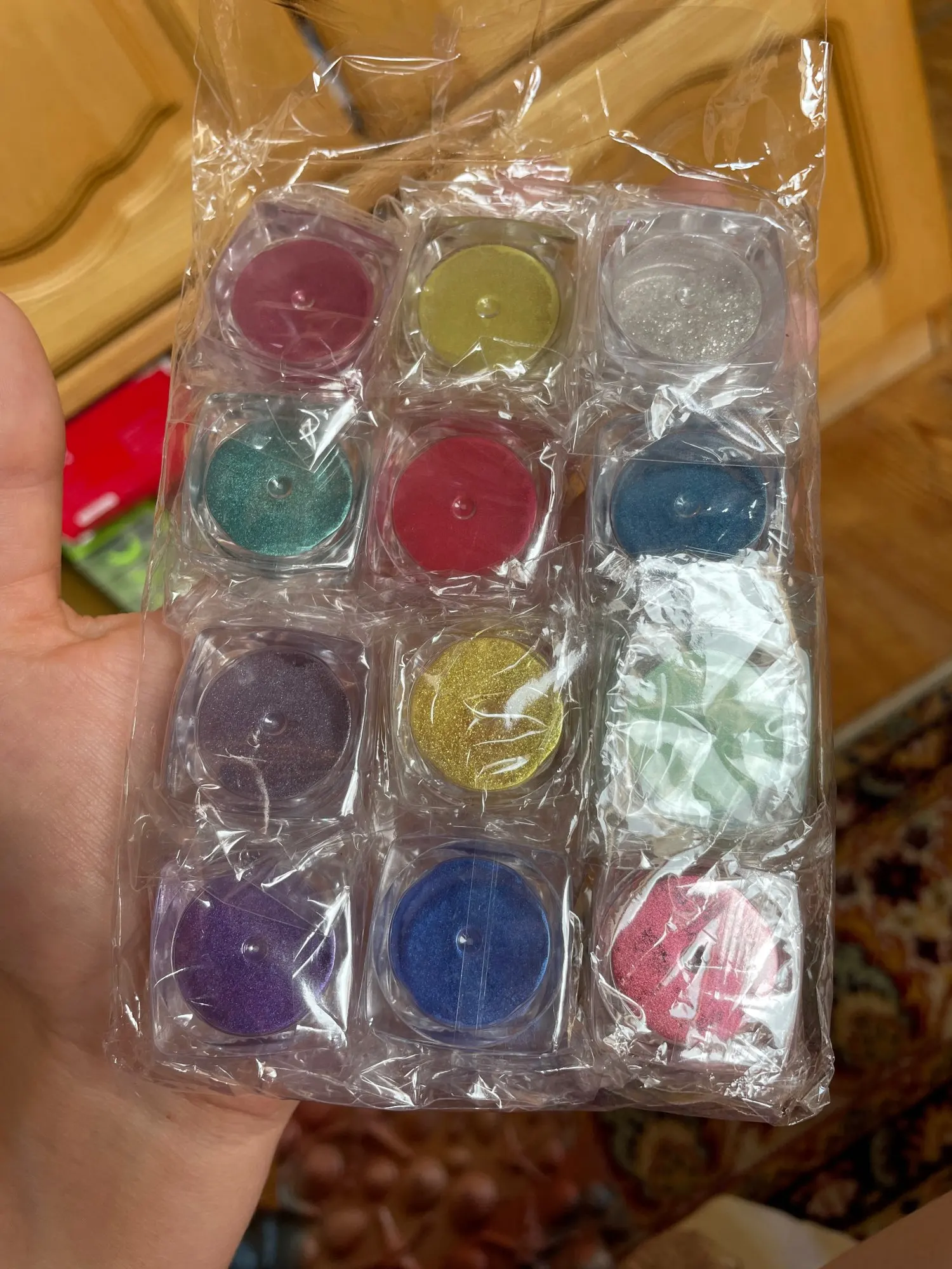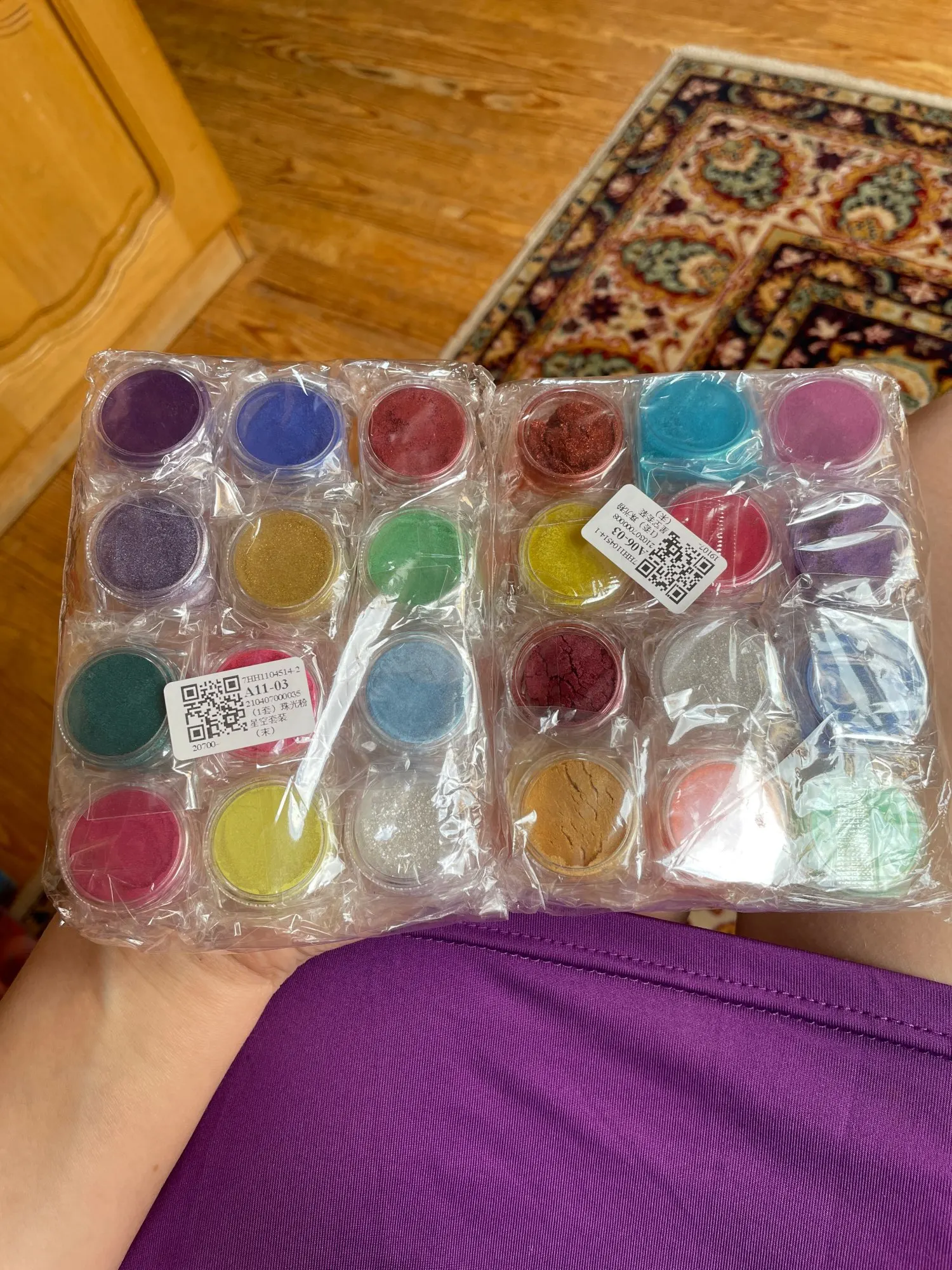 Среди 2х лотов 2 цвета повторяющиеся- серебристо-перламутровый и один из оттенков фиолетового. Одна баночка чуть рассыпалась. Упаковано в целом хорошо. Каждая баночка в пакетике и вспомни в общем и в конверте-пупырке. Помол мелкий. При втирании в топ без липкости будет скорее всего эффект так себе, а вот на липкий слой гель-лака должно быть ок. Либо смешивать с топом и намешивать свои шиммерные цветники. Наполнение 1/2 баночки. Шло до Москвы месяца 1,5. При такой стоимости набора считаю что это долго.