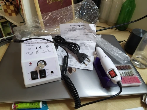 Упаковка была на удивление легкой. Корпус машины и все остальное изготовлены из пластика. Хорошо упаковано. Отлично работает. Несколько переключателей помогают в соответствии с ситуацией, в которой вы хотите выключить устройство. Кончики для маникюра также работают хорошо, в соответствии с качеством продукта.